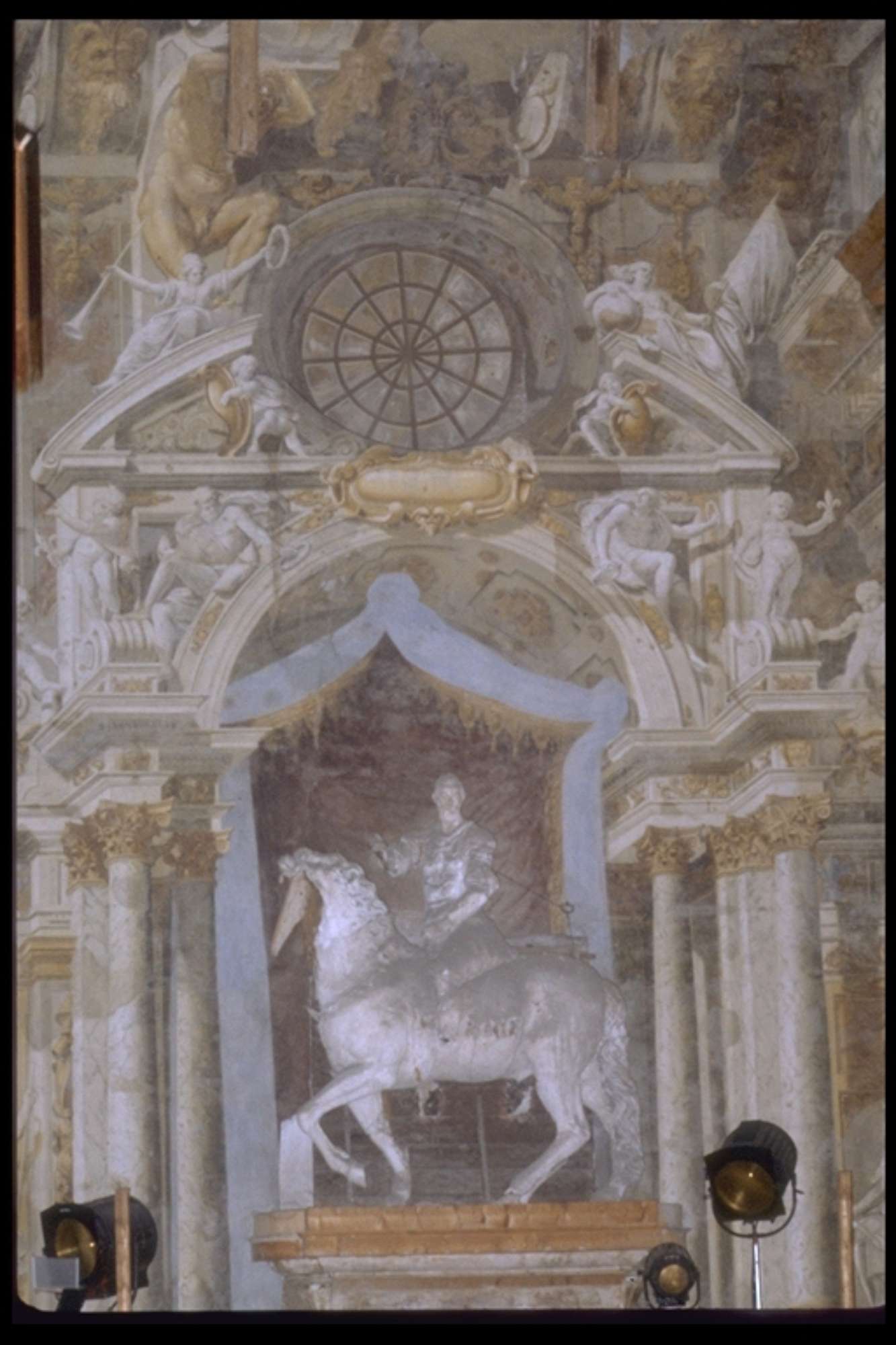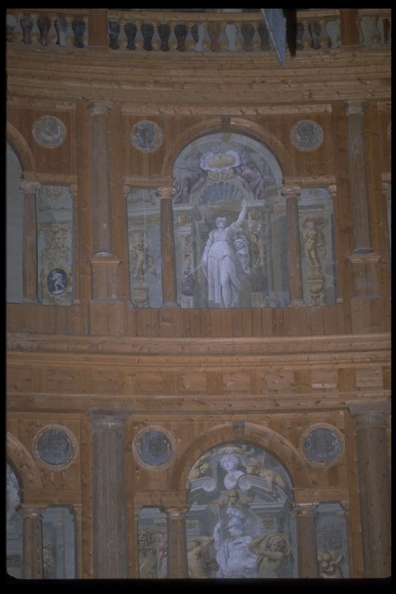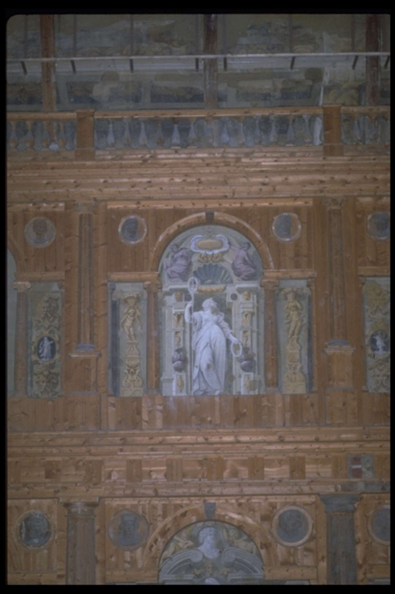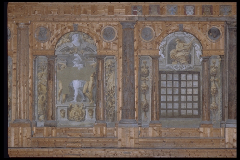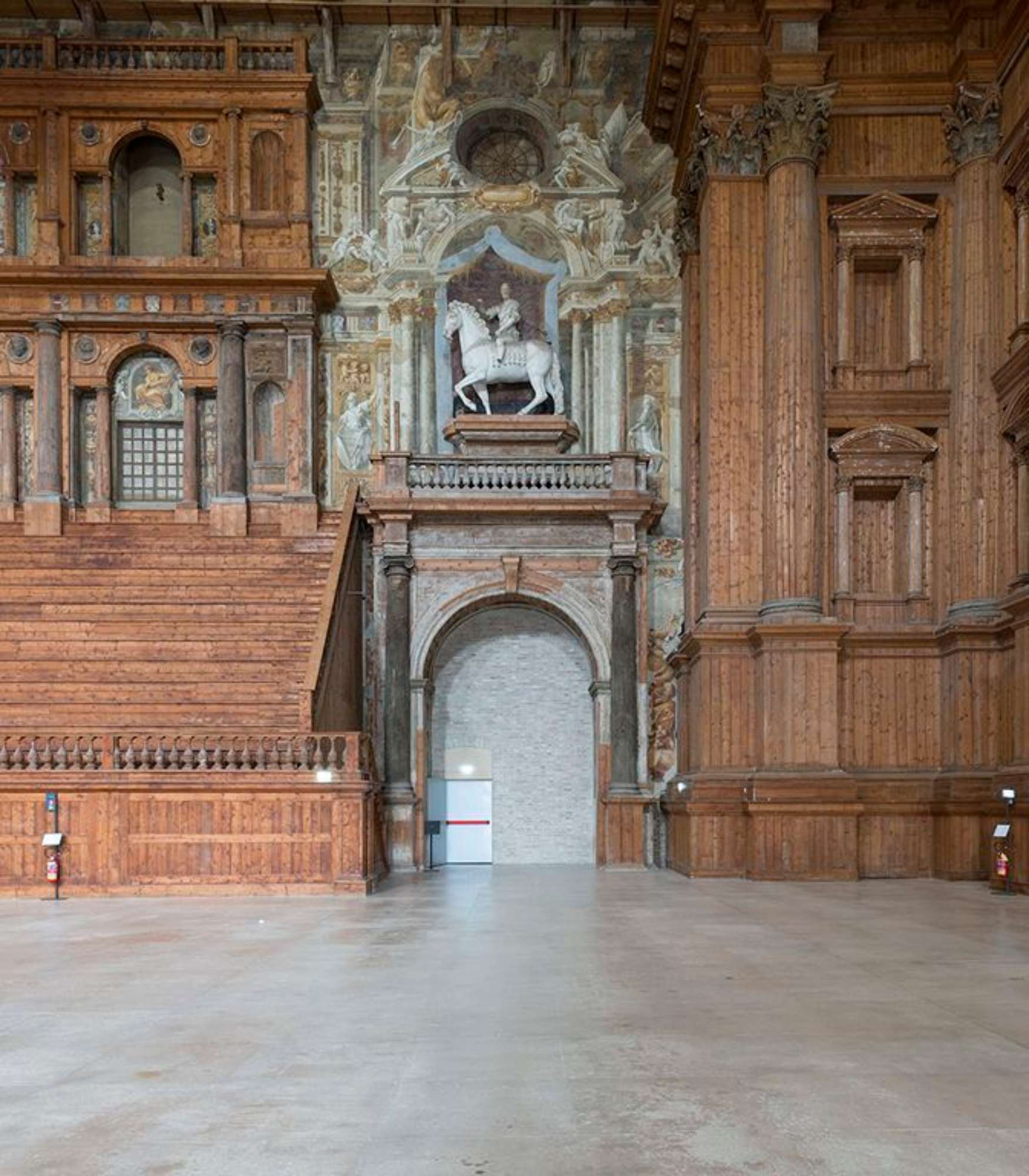 A raccordo con la zona del proscenio sono poste le due statue equestri del Reti raffiguranti Odoardo e Ranuccio Farnese, collocate in finte nicchie dipinte e popolate di deità' presenti anche nel soffitto che fingeva il cielo stellato e che ora mostra le capriate lignee, in parte ancora originali, Il boccascena è inquadrato da una partitura architettonica in cui un ordine gigante di colonne e lesene alternate racchiude un doppio ordine di nicchie e finestre cieche.