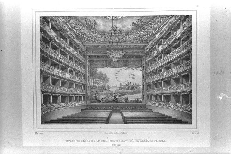 Parma, Teatro Regio, la sala teatrale. Da G. B. Niccolosi, Il Nuovo Teatro di Parma, rappresentato con tavole intagliate nello studio di P. Toschi, Parma 1829 (Fototeca IBC)