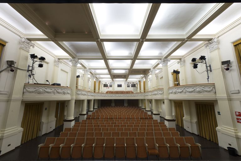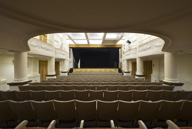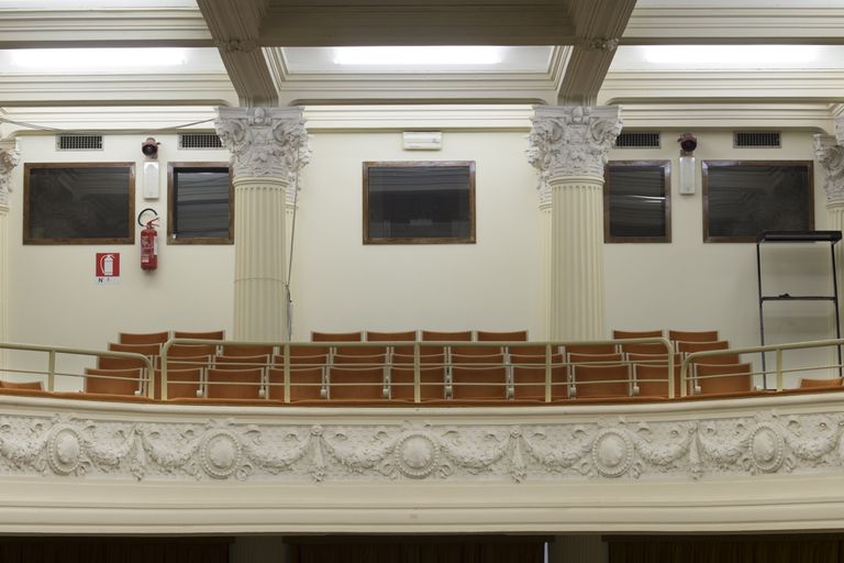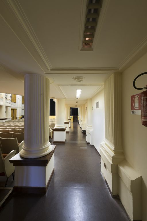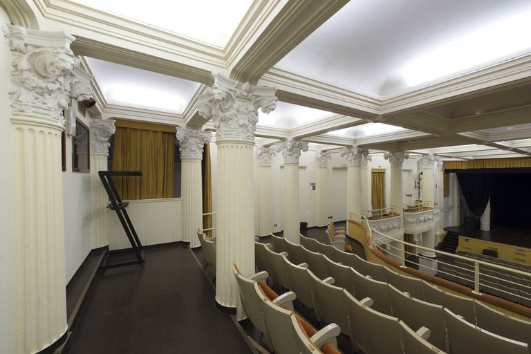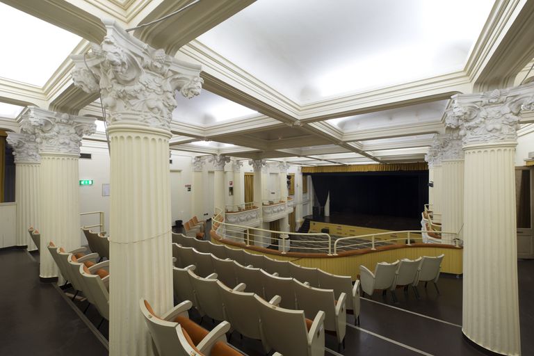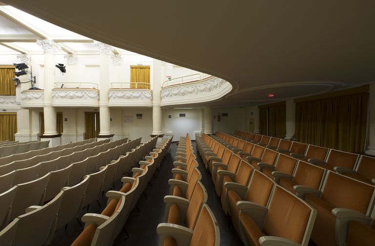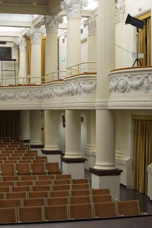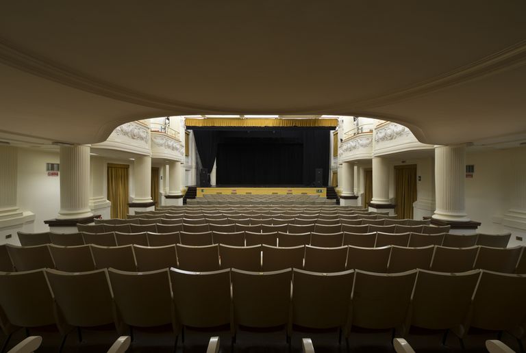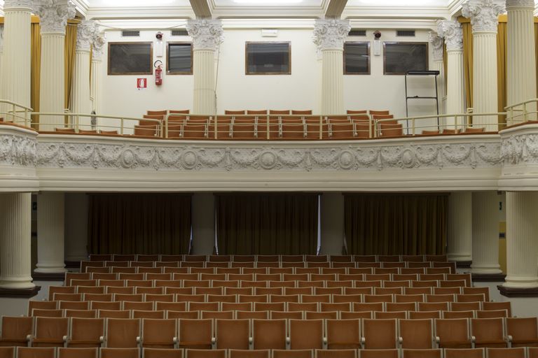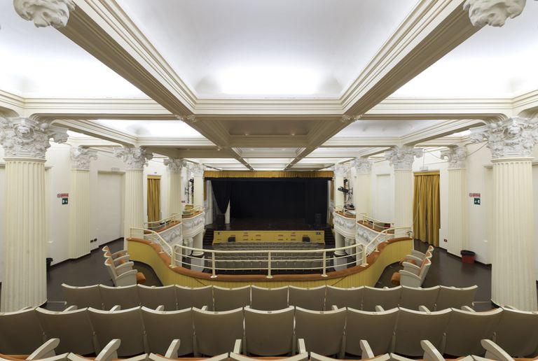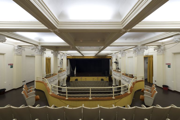 La sala a pianta rettangolare, costituita da platea e da un’unica galleria, si caratterizza per la presenza di snelle colonne scanalate poste su plinti che delimitano lo spazio del pubblico. Queste colonne sono ornate da elaborati capitelli in stucco bianco con teste leonine ed elementi fitomorfi. Le pareti sono invece scandite da lesene anch’esse scanalate e ornate da capitelli con teste d’ariete ed elementi vegetali. La galleria è delimitata da un parapetto a fascia continua e con andamento curvilineo che, lungo le pareti in corrispondenza delle colonne, forma una sorta di balconcini. L’ornamento del parapetto è costituito da ghirlande in stucco. Il soffitto è costituito da elementi quadrangolari che poggiano sopra le colonne.