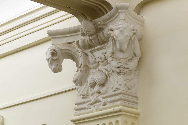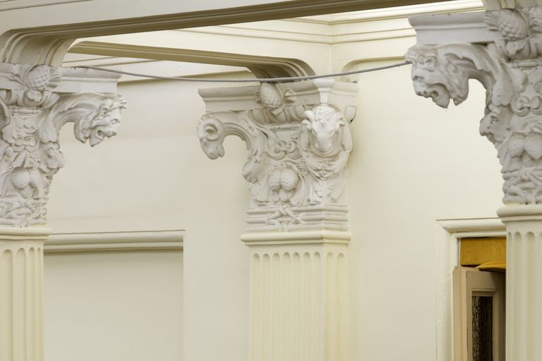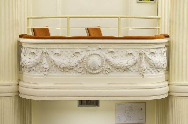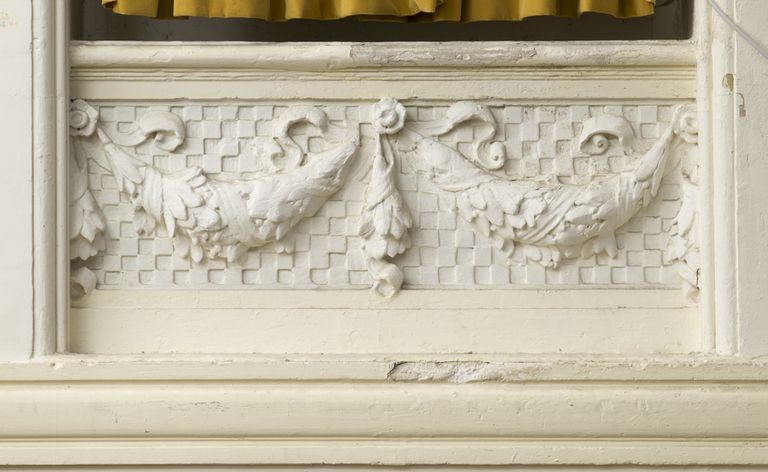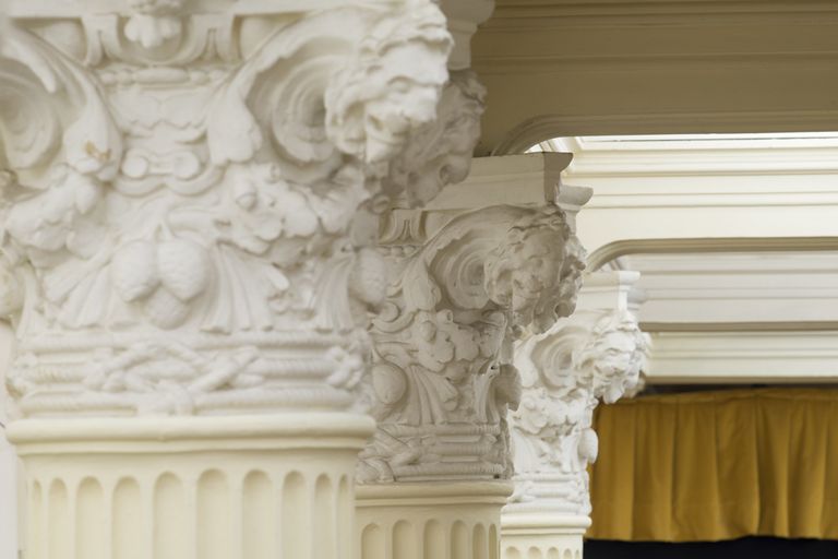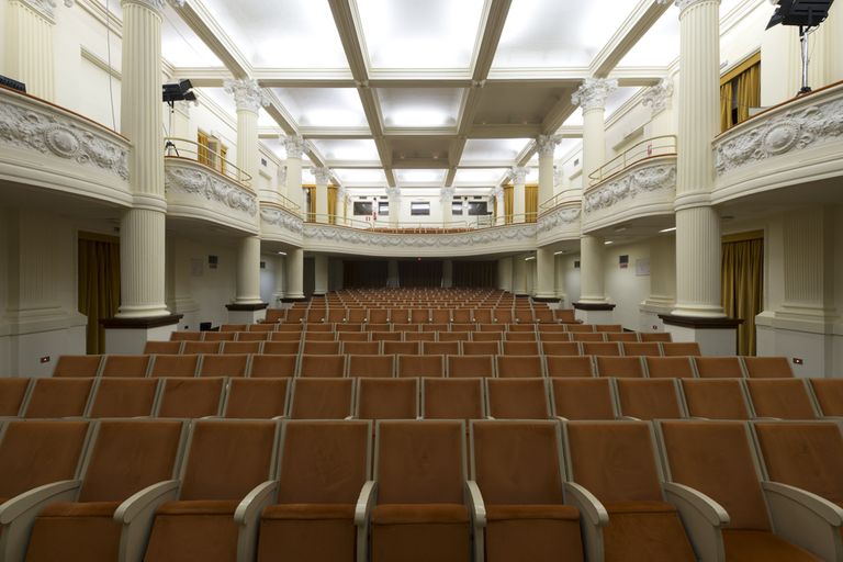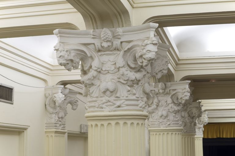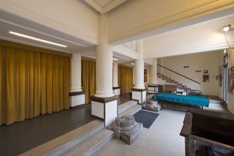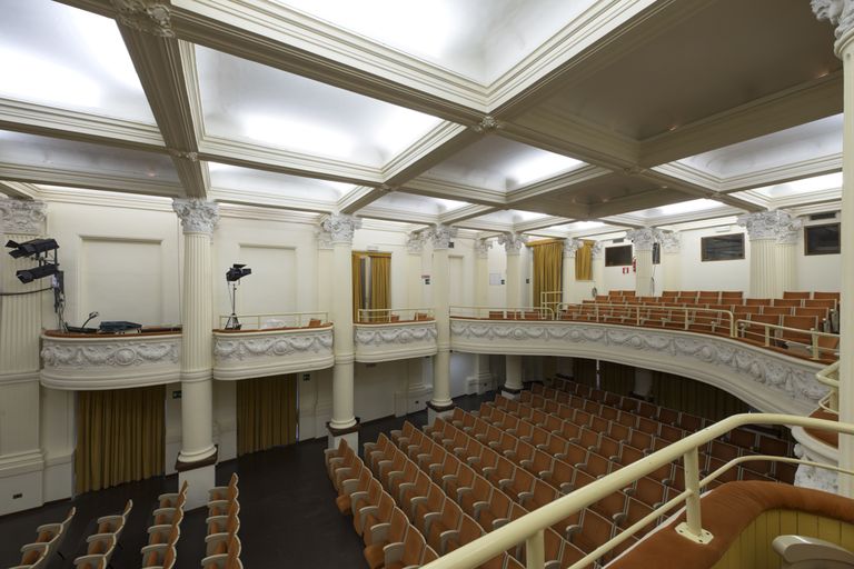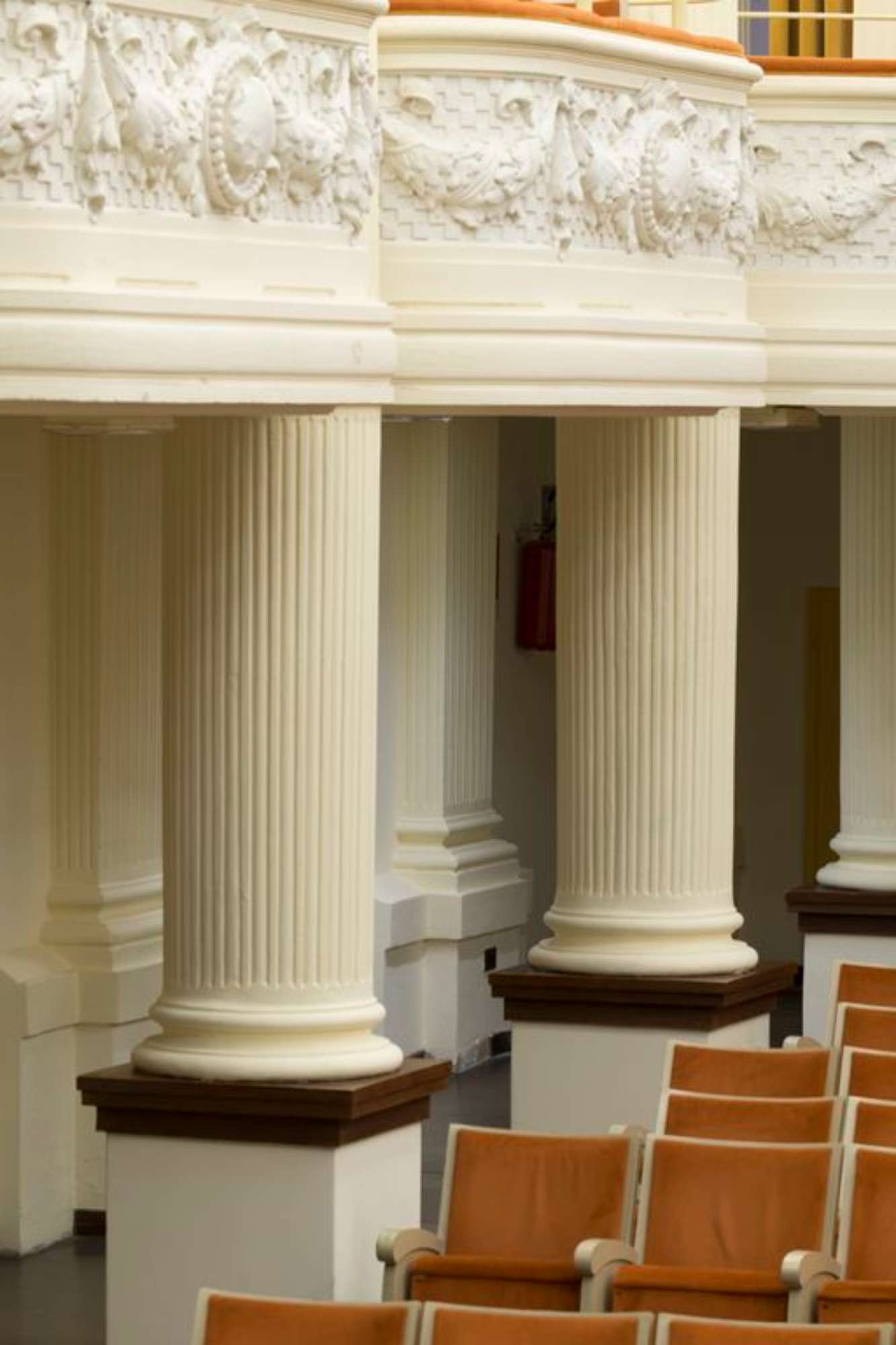 La sala a pianta rettangolare, costituita da platea e da un’unica galleria, si caratterizza per la presenza di snelle colonne scanalate poste su plinti che delimitano lo spazio del pubblico. Queste colonne sono ornate da elaborati capitelli in stucco bianco con teste leonine ed elementi fitomorfi. Le pareti sono invece scandite da lesene anch’esse scanalate e ornate da capitelli con teste d’ariete ed elementi vegetali. La galleria è delimitata da un parapetto a fascia continua e con andamento curvilineo che, lungo le pareti in corrispondenza delle colonne, forma una sorta di balconcini. L’ornamento del parapetto è costituito da ghirlande in stucco. Il soffitto è costituito da elementi quadrangolari che poggiano sopra le colonne.