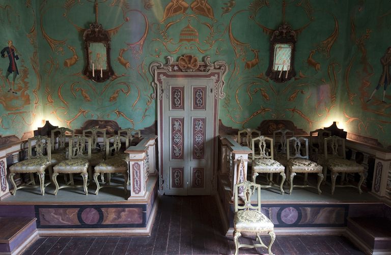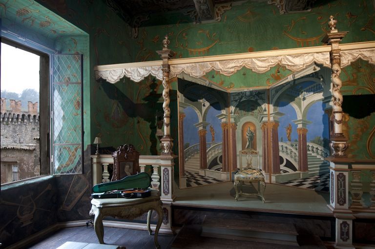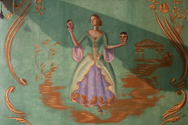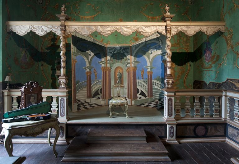 Il teatrino, che possiamo ipotizzare sia uno dei più piccoli al mondo, è posto in una sala rettangolare, al primo piano dell’antico Castello di Vigoleno, un imponente complesso fortificato medievale pervenutoci pressoché intatto. Dal 1922 al 1935 lo storico edificio fu proprietà della principessa Maria Ruspoli Gramont, che lo aveva ricevuto in dono dalla madre. Nel 1922, volendo rendere abitabile il maniero, al tempo gravemente degradato, la principessa diede avvio a numerosi e importanti restauri, in tale occasione fu realizzato questo teatrino. La stessa Ruspoli afferma in una lettera che fu il pittore russo Alexandre Jacovleff (Pietroburgo 1887 – Parigi 1938) a ‘fare’ il teatro che tuttora si conserva.