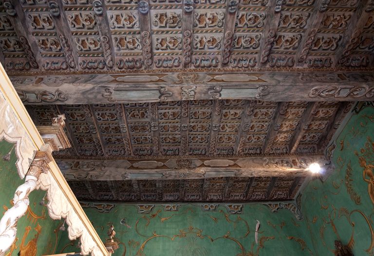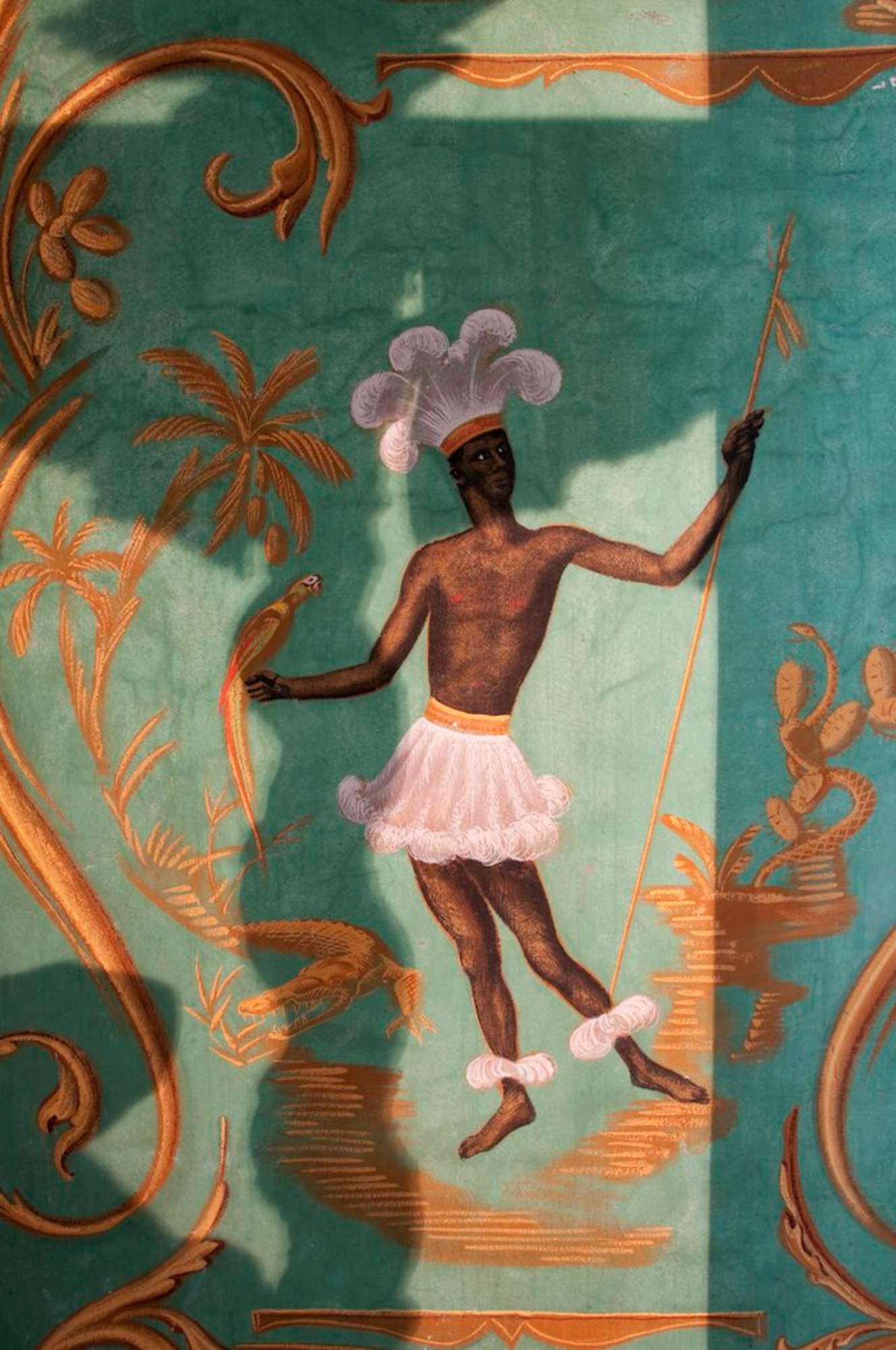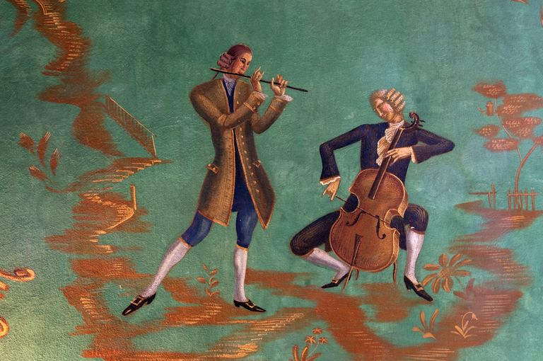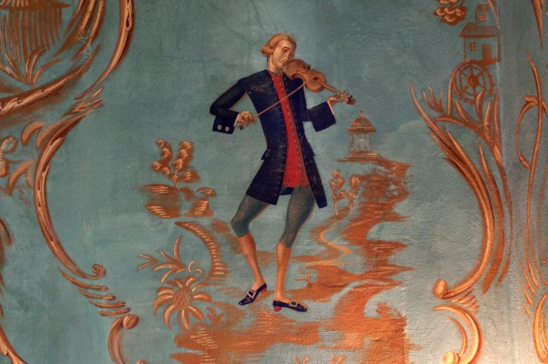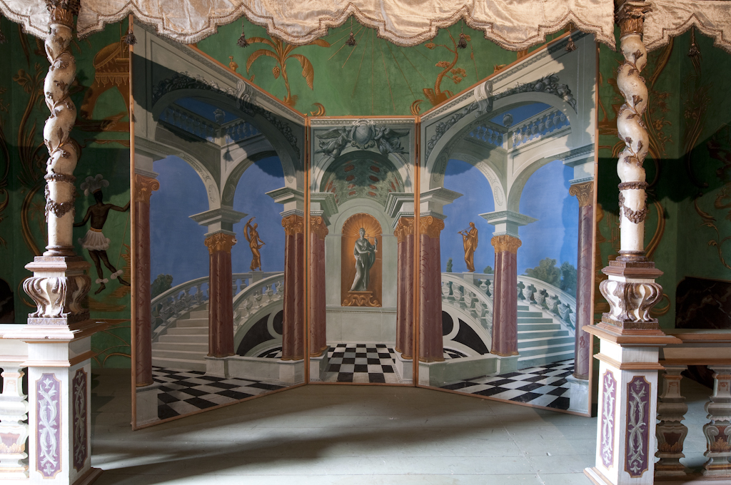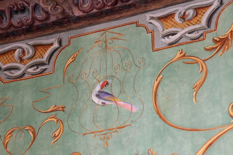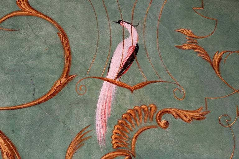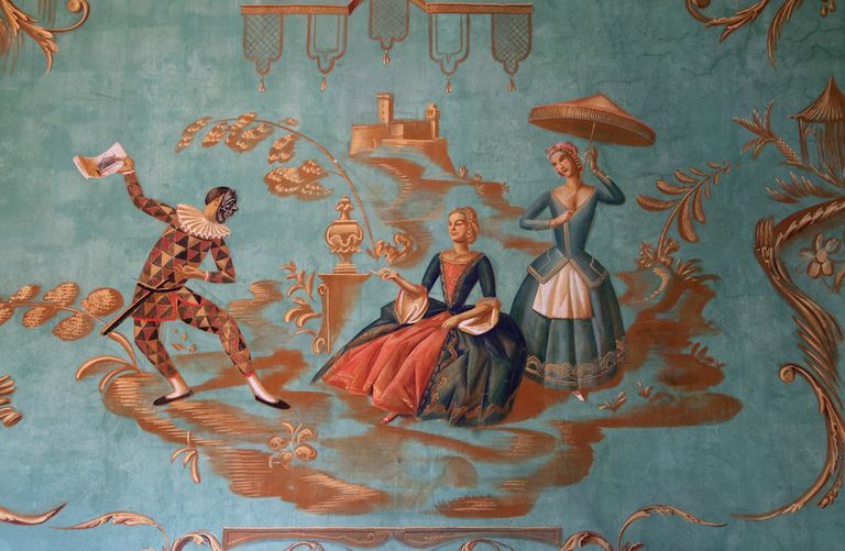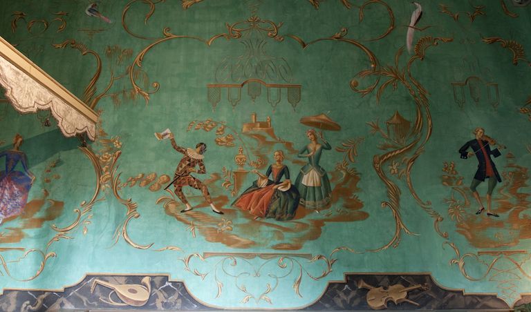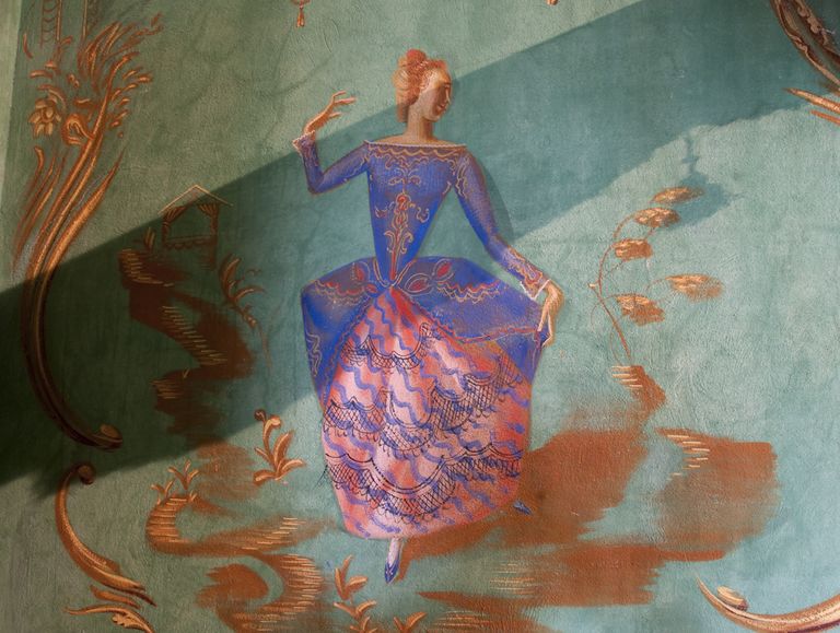 Jacovleff realizzò a tinte vivaci decori di gusto chinoise, rappresentando animali, maschere della Commedia dell’Arte, figure esotiche e danzanti dalla connotazione simbolica, musici e dame in abiti settecenteschi, tra cui ritrasse la stessa principessa, il tutto raccordato da una fitta vegetazione a tralci. Mentre la rappresentazione stilizzata di un elegante patio baroccheggiante, con scale, colonne ed arcate e statue trompe-l'oeil, posta al centro della scena, riconduce al realismo magico di Gino Severini.