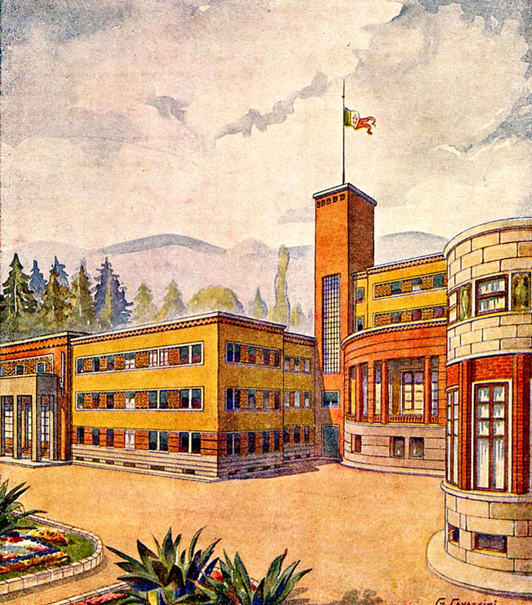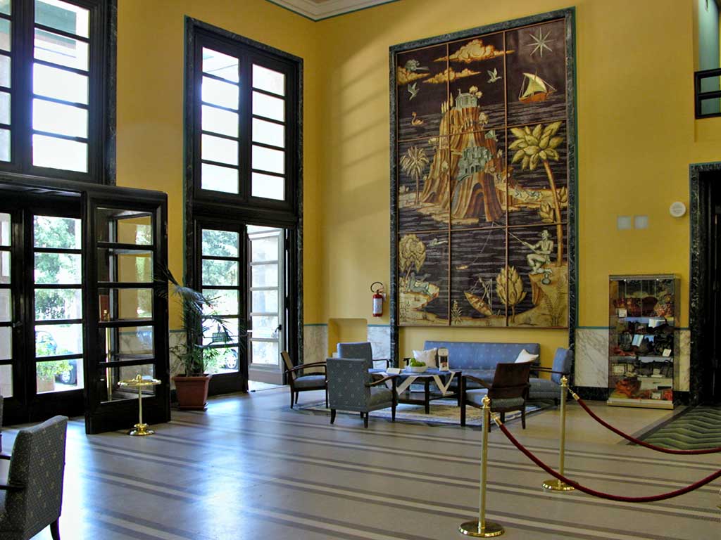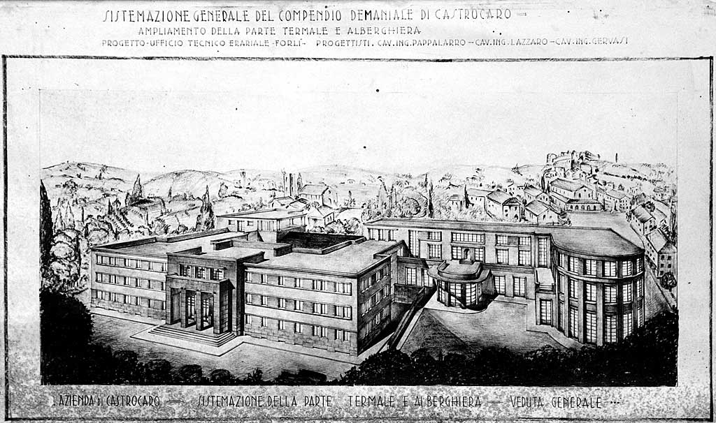 Nel 1929 la proprietà dei bagni, integrati nel 1924 con il complesso architettonico della “Fonte Littoria”, decorato con le maioliche della fabbrica Focaccia e Melandri, venne ceduta dagli eredi Conti all’INA. Nel 1936 le terme passarono allo Stato, con la denominazione di Regie Terme di Castrocaro, su ordine di Mussolini, il quale utilizzò personalmente lo stabilimento, alloggiando i propri ospiti al Grand Hotel (1939). L’edificio, progettato da Tito Chini (Borgo S.Lorenzo, 1898-Desio, 1947), rappresentò uno degli esempi più significativi del déco italiano prodotto dalla manifattura ceramica di Borgo S.Lorenzo. L’intervento del celebre designer e decoratore fiorentino, impose variazioni al progetto originale, dovuto, per gli stabilimenti termali, all’ingegner Diego Corsani: tra questi l’innalzamento di un piano di una parte dell’edificio, la terrazza verso il parco, e la torre dell’acqua. Di grande pregio le ornamentazioni del Padiglione delle Feste (1936-1941), progettato dal Corsani ma reinventato dalla creatività del Chini, coadiuvato, per le parti dipinte, dai disegnatori Donatello e Loris Faggi, e da Cosimo Donatini. Sapiente anche l’uso dei materiali: cotto (mattoni a vista), marmo nero, travertino e ceramica iridescente (Tramonti).
