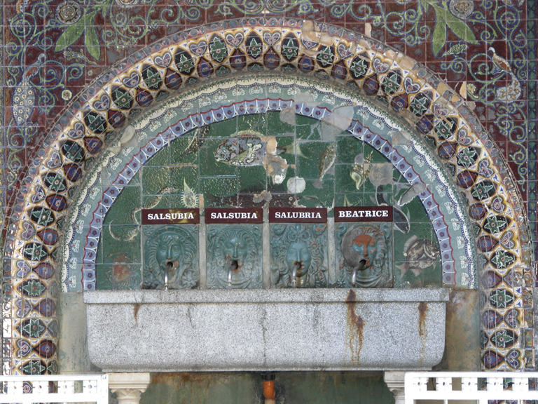 Il complesso termale di Castrocaro, utilizzato dal 1830 grazie alle proprietà delle acque salmastre scoperte in età moderna dal prof. Antonio Targioni Tozzetti, fu inaugurato ufficialmente nel 1851 per iniziativa del conte Antonio Marescotti, che mise a disposizione della struttura il palazzo già appartenuto ai conti Guarini. Nel 1869, l’acquisto delle sorgenti da parte del dott. Aristide Conti diede un nuovo impulso alla nascente industria termale, aumentata di un nuovo stabilimento. Nel 1887 fu avviata la costruzione delle Terme Conti, e nel 1899 ebbe inizio la sistemazione del parco, poi decorato con le sculture prodotte dal primo quarto del XIX secolo dalla bottega dello scultore Casalini. Al 1924 risale invece il complesso architettonico e decorativo della “Fonte Littoria”, dovuto alla fabbrica di maioliche Focaccia e Melandri.