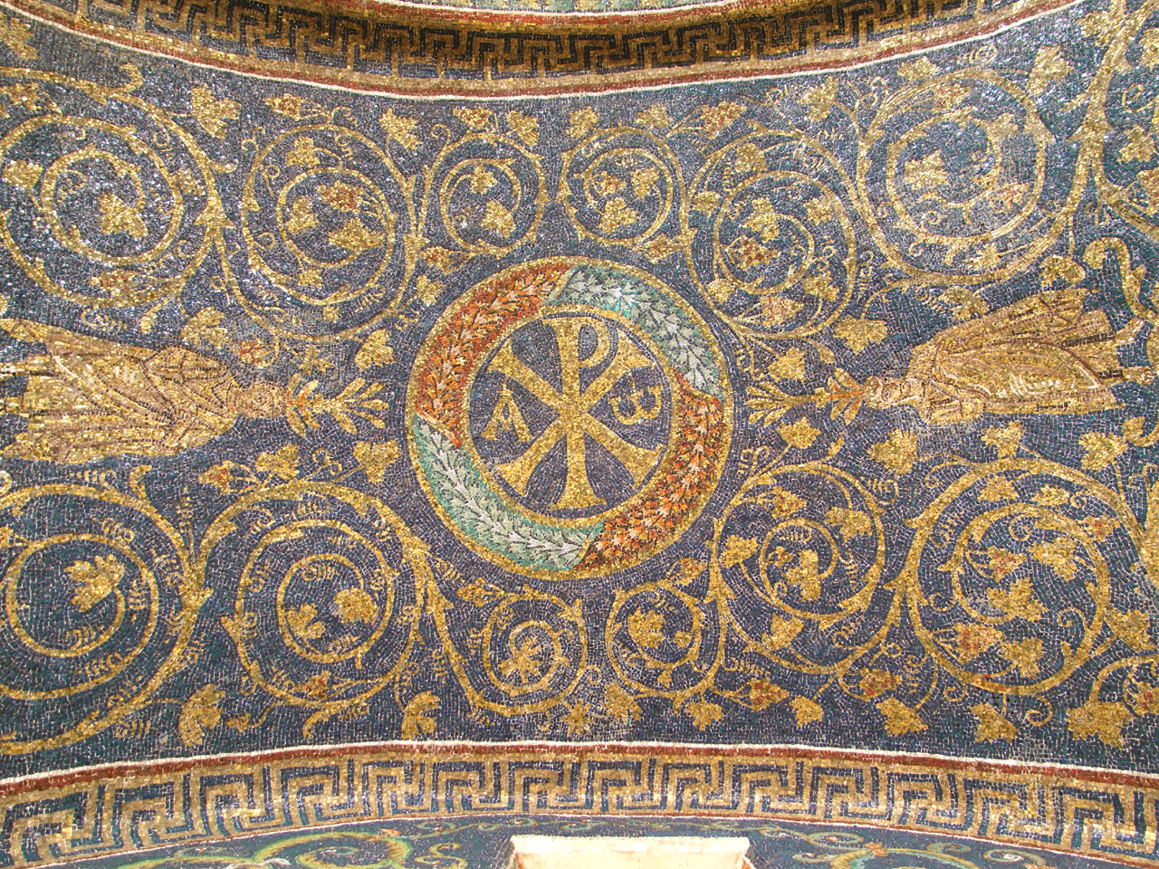 Secondo Clementina Rizzardi (IL MAUSOLEO DI GALLA PLACIDIA 1996, p. 222) il motivo dei tralci di vite si inserisce nella tematica morte- resurrezione-vita, ed ha nel Vangelo di S. Giovanni la principale fonte così come avviene anche per i testi patristici. Raffaella Farioli (FARIOLI 1977, Ravenna romana e bizantina, p. 61) ne ricorda l'originaria provenienza dalla simbologia dionisiaco-sepolcrale. Paolo Lino Zovatto (ZOVATTO 1968, Il Mausoleo di Galla Placidia, p. 74), identificando i personaggi in tunica aurea come apostoli, vede nel clipeo con chrismon e nelle lettere greche alfa e omega un'allusione alla Parousia, ovvero alla seconda venuta del Cristo.