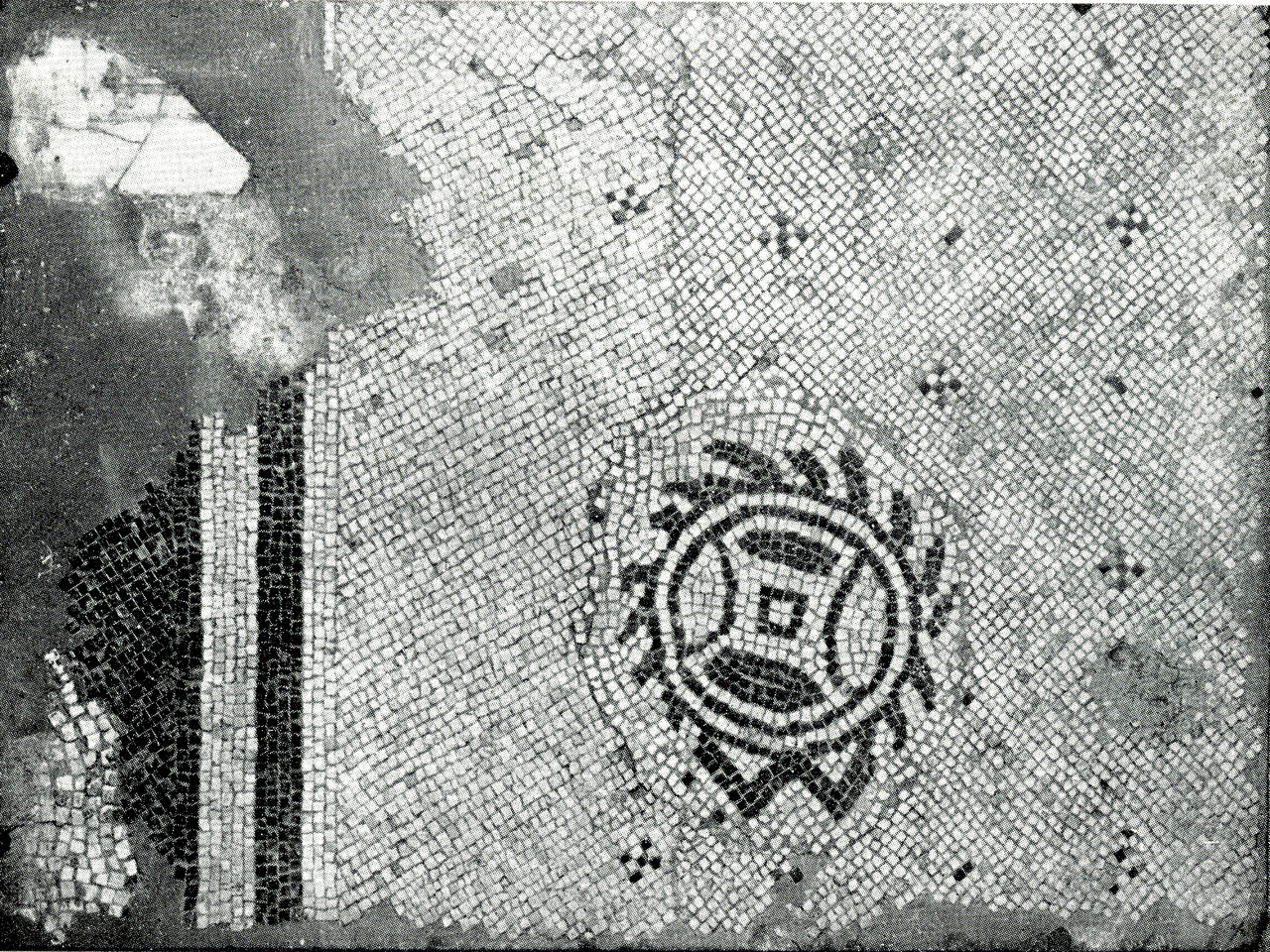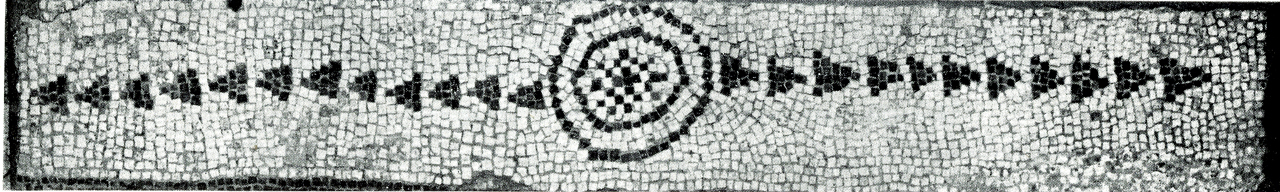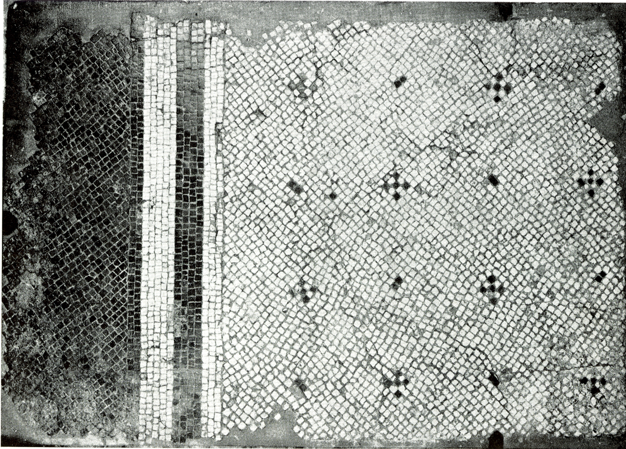 Il frammento (1) è un tessellato bianco a ordito diagonale con punteggiato di crocette monocrome nere, collocate a intervalli regolari di 15 cm (BALMELLE 1985, Le decor geometrique de la mosaique, tav. 5, c). Il frammento (2) è un tessellato bianco a ordito diagonale con punteggiato di crocette nere, alternate a tessere rettangolari a zampe di gallina (BALMELLE 1985, Le decor geometrique de la mosaique, tav. 107, d), collocate a intervalli regolari di 20 cm, con doppia fascia verticale bianca e nera. Il frammento (3) è un tessellato monocromo bianco a ordito di filari spezzati (BALMELLE, Le decor geometrique de la mosaique, tav. 108, c) con punteggiato di crocette nere collocate a intervalli regolari di 15 cm. Nel campo è stato inserito un motivo circolare costituito da due file di tessere intervallate, da cui partono 14 raggi neri ed una linea spezzata a doppia V. Al centro si trova un quadrato chiuso fra due lati concavi e due elementi ovali neri. Il frammento (4) è un tessellato bianco a ordito di filari paralleli irregolari (BALMELLE 1985, Le decor geometrique de la mosaique, tav. 105, a), con decorazione costituita da due file di spine corte dentate (BALMELLE 1985, Le decor geometrique de la mosaique, tav. 12, a) con i vertici volti all'esterno, ai lati di due cerchi concentrici, campiti da una crocetta nera attorniata da una scacchiera.