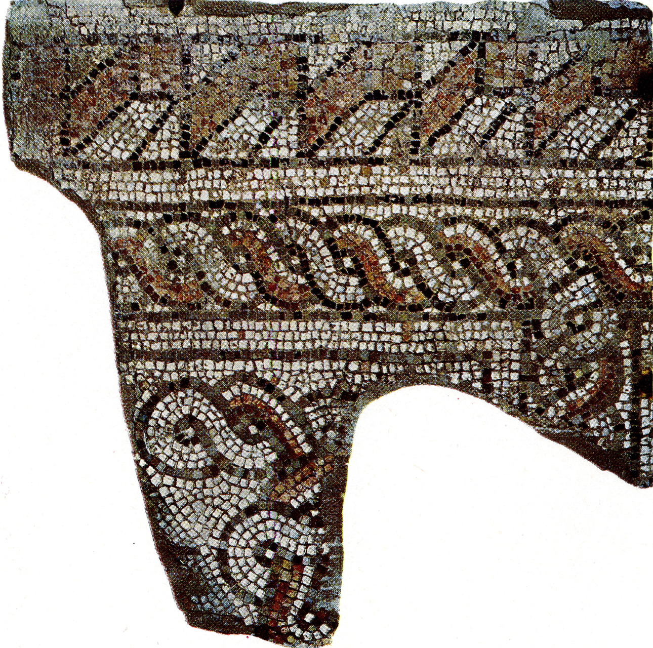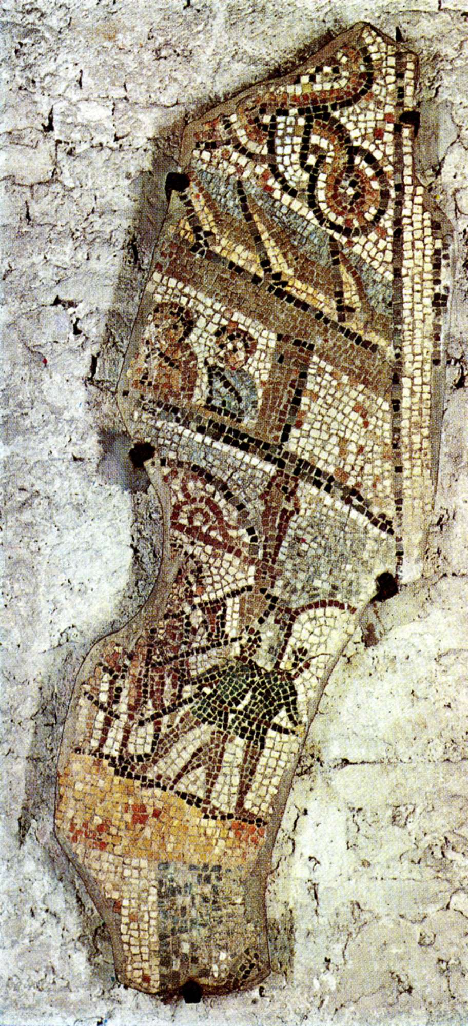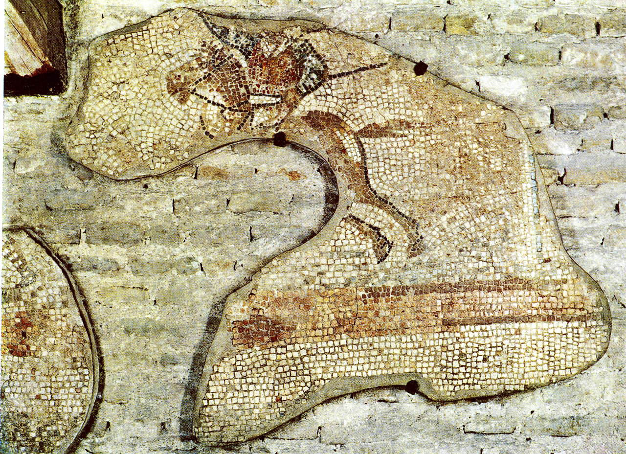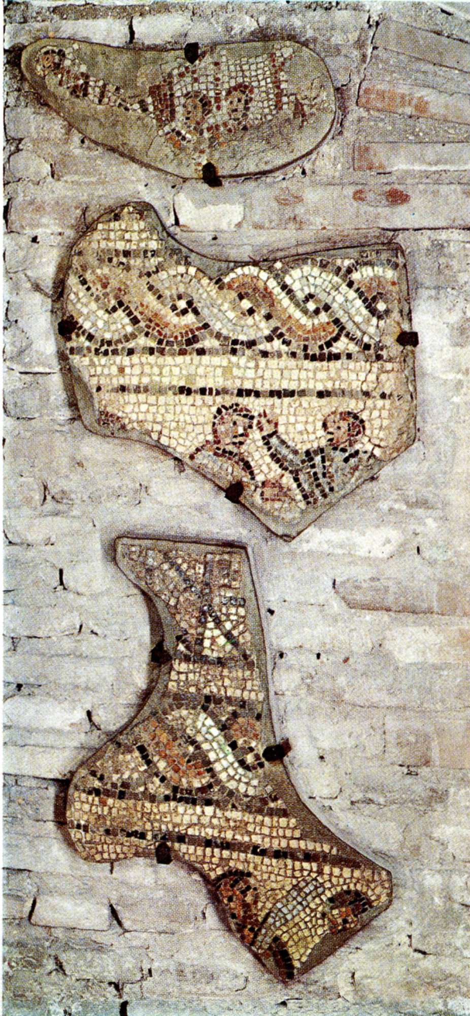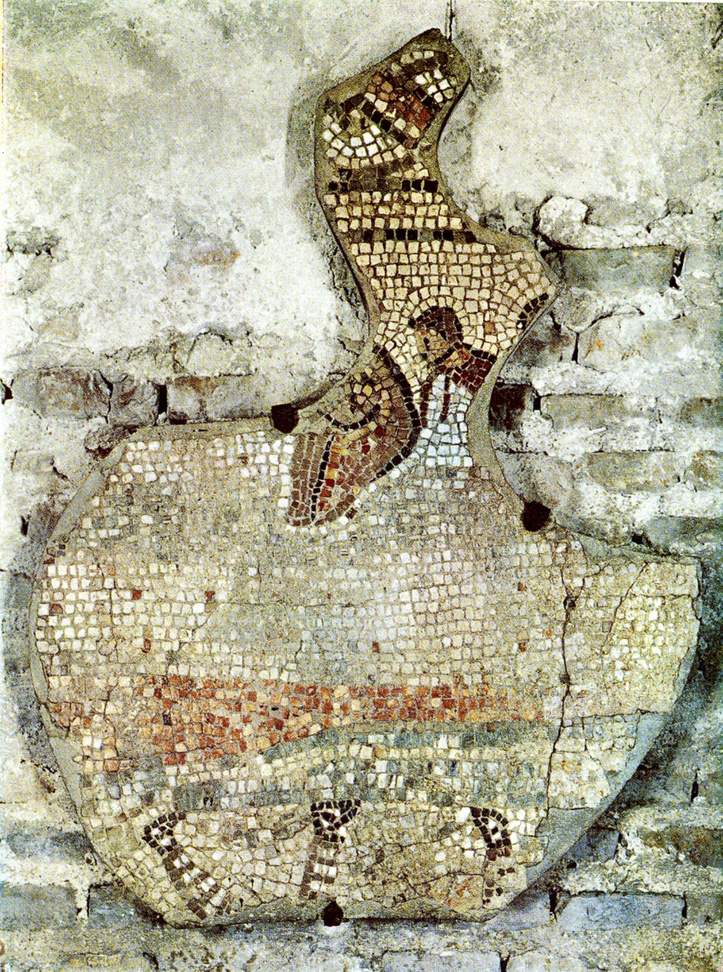 I frammenti superstiti presentano decorazioni policrome con la raffigurazione delle arcate dei carceres, con inservienti che aprono un cancello e una quadriga pronta per uscire; alcuni personaggi stilizzati; un cavaliere, con tunica bianca e casacca rossa, arancione e verde, su un cavallo al galoppo; le gambe di due gladiatori con calcei e calzature a legacci trasversali.I personaggi stilizzati potrebbero raffigurare, secondo Fede Berti, degli spettatori in tribuna (BERTI 1976, Regione 8. : Ravenna, p. 45).