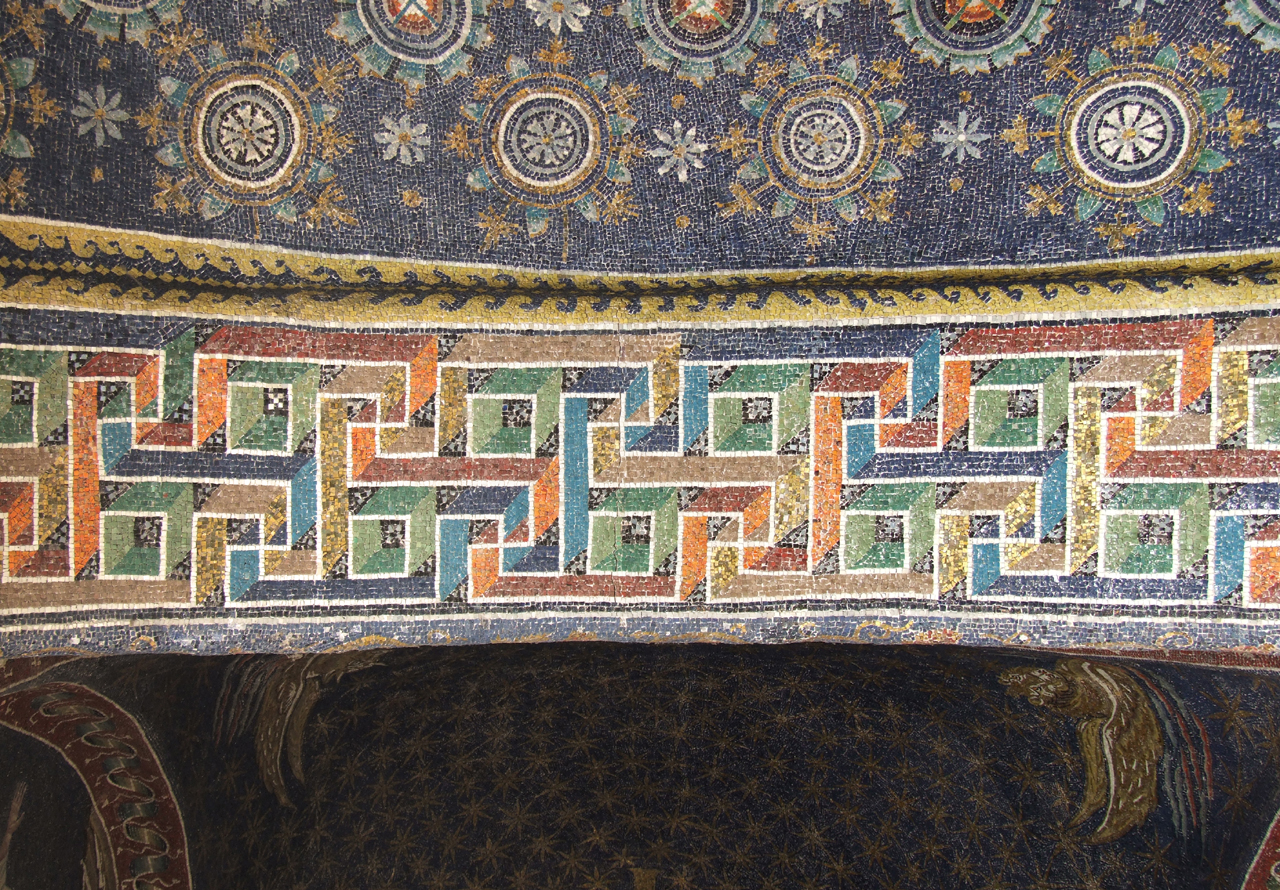 Meandro di svastiche a giro doppio e quadrati in prospettiva, policromo (BALMELLE 1985, Le décor géométrique de la mosaique, tav. 41, c).