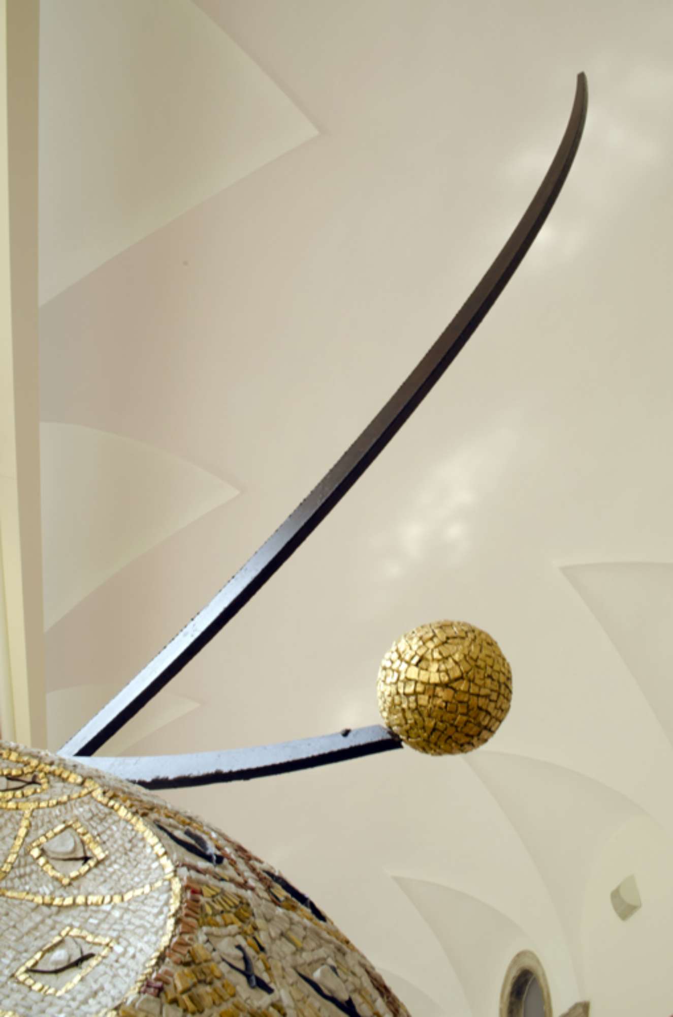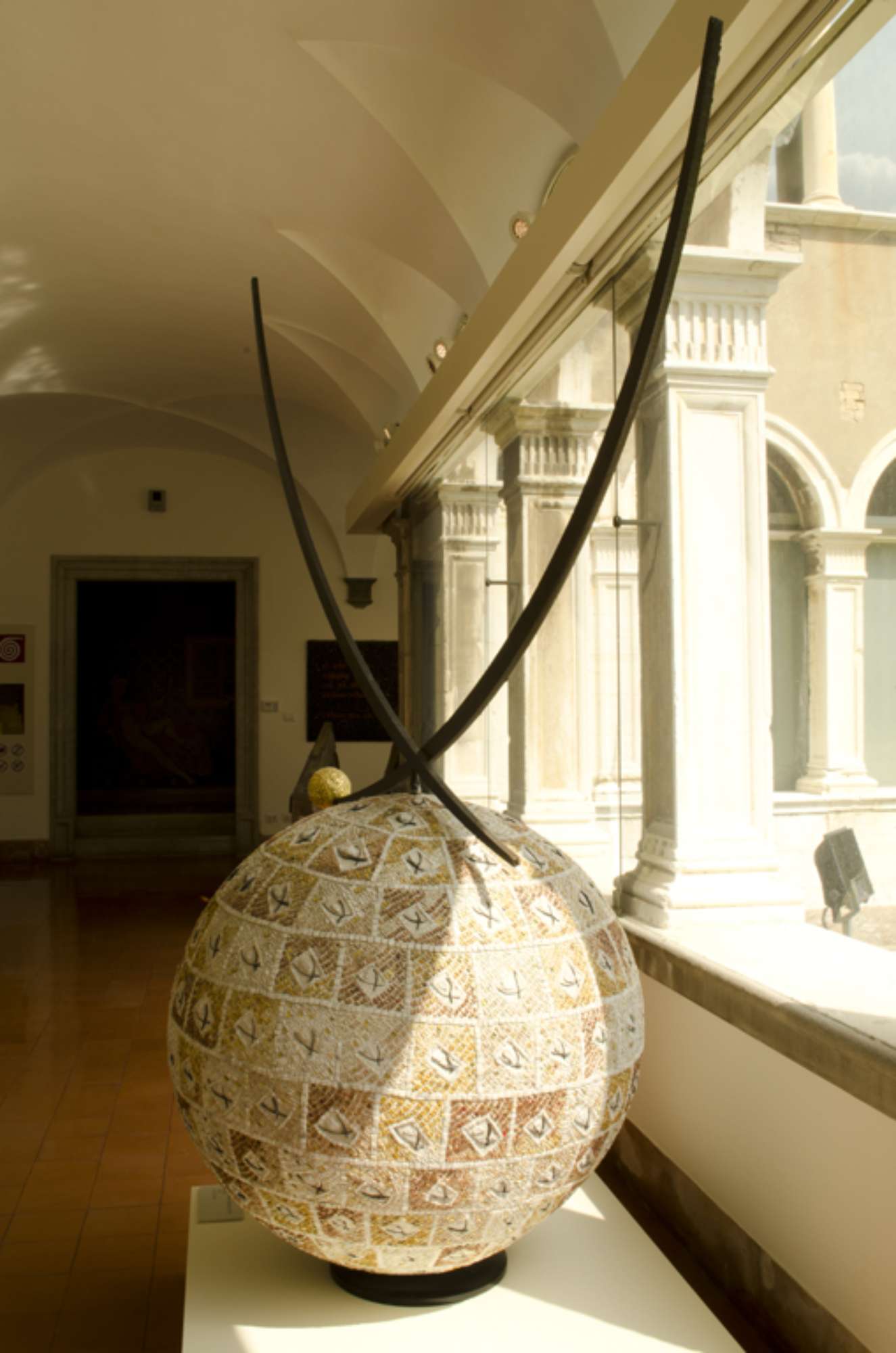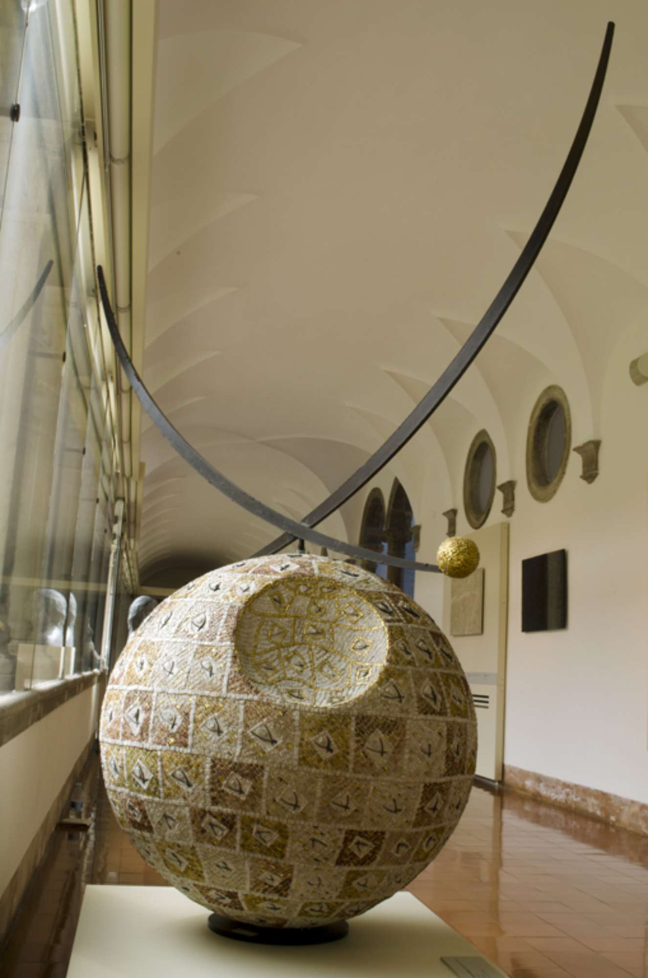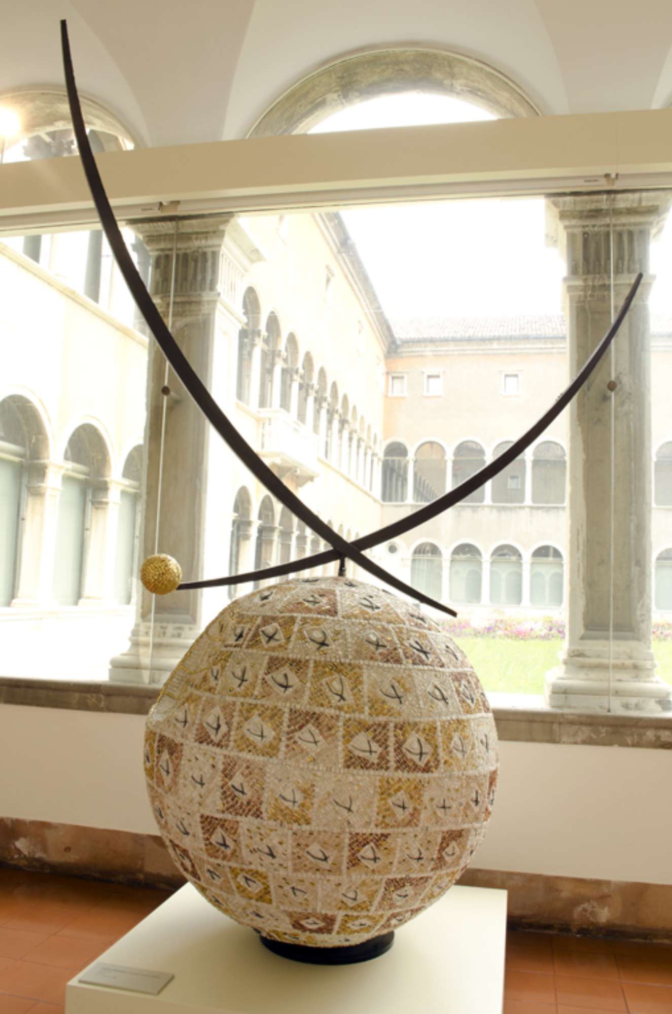 La scultura si compone di un elemento sferico su cui si innesta una struttura composta da due elementi metallici a sezione quadrata arcuati, a capo di uno dell'elemento di destra è posta una piccola sfera rivestita da tessere dorate, tra le quali compae una tessera in ceramica bianca la firma dell'artista.