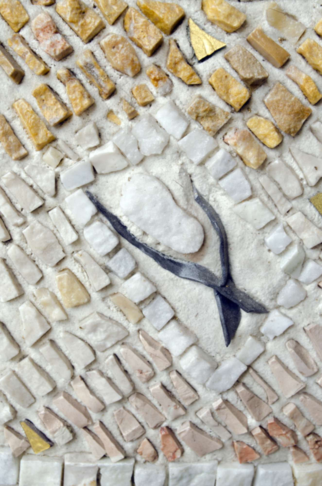 La superficie curva è rivestita da tessere vetrose e lapidee disposte secondo un ordine geometrico a formare riquadri entro i quali, direttamente sulla malta, si inseriscono lamine di metallo che ripetono nella forma arcuata e nella materia l'elemento che conclude la scultura nella parte superiore.