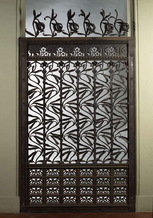 Cancello ad un’anta – inv. 4292/1986 – in ferro battuto, progettato da Giuseppe De Col (Belluno, 1863-Bologna, 1912) e realizzato nel 1902 nella rinomata officina di Pietro Maccaferri (Bologna, 1859-1941).