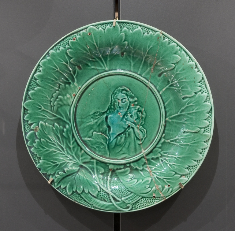 Altri oggetti ancora provengono da manifatture inglesi, come la famosa Wedgwood, alla quale appartiene il piatto da parata a smalto verde con rappresentazione della maternità.