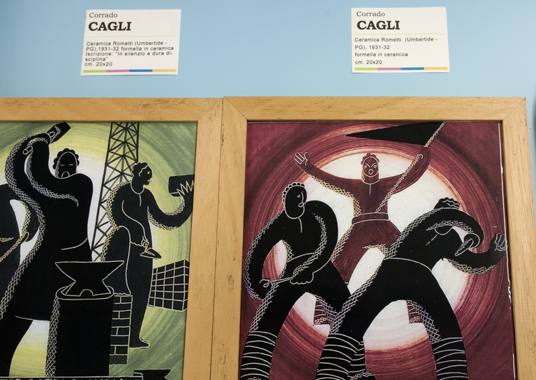 Interessante è il gruppo costituito da cinque piastrelle e un bassorilievo realizzati presso lo stabilimento delle Ceramiche Rometti di Umbertide, delle quali si hanno notizie in merito alla data di esecuzione nel 1931-32 e agli autori Corrado Cagli e Dante Baldelli.