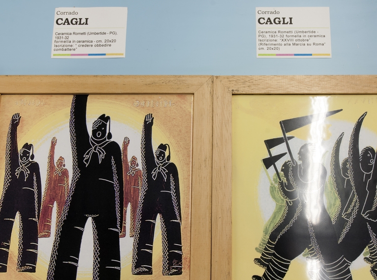 Corrado Cagli, Dante Baldelli FONDAZIONE DEI FASCI DI COMBATTIMENTO IN SILENZIO E DURA DISCIPLINA 2 Piastrelle in ceramica dipinta a mano Ceramica Rometti, Umbertide 1931-32 cm.20×20 cad. (Foto A. Scardova, IBC 2016)
