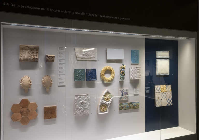 Costruzione ex novo dello spazio espositivo della collezione storica aziendale di ceramiche con ricostruzione visiva semplice ma di rigore filologico del patrimonio e allestimento del museo multimediale con documentazione video, fotografica, testuale su contesto storico culturale degli oggetti e anche interattiva, come nel lungo tavolo che accoglie un nastro di immagini in movimento sul ciclo produttivo attuale. (S.Ferrari, IBC, 2016)