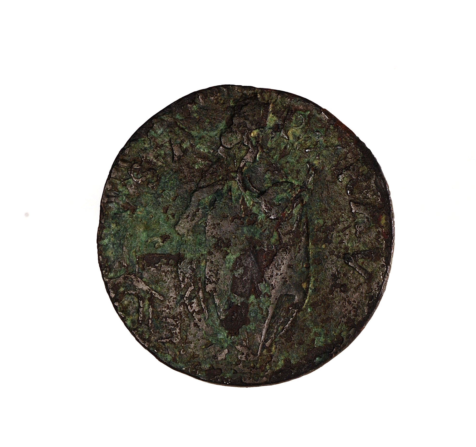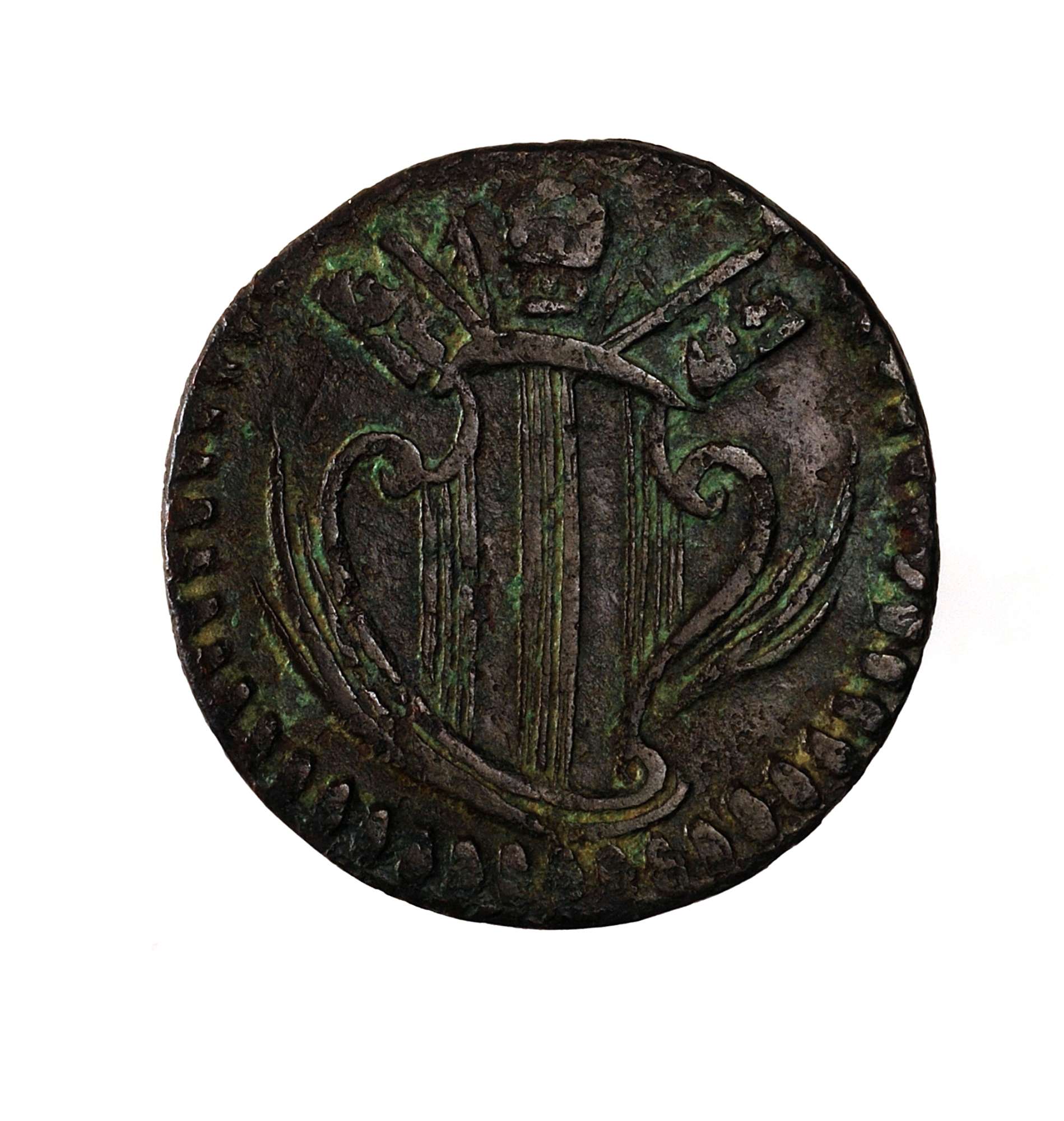 Dritto: Stemma sagomato con punta rivolta a d., sormontato da tiara e chiavi decussate, fra due rami di pino.