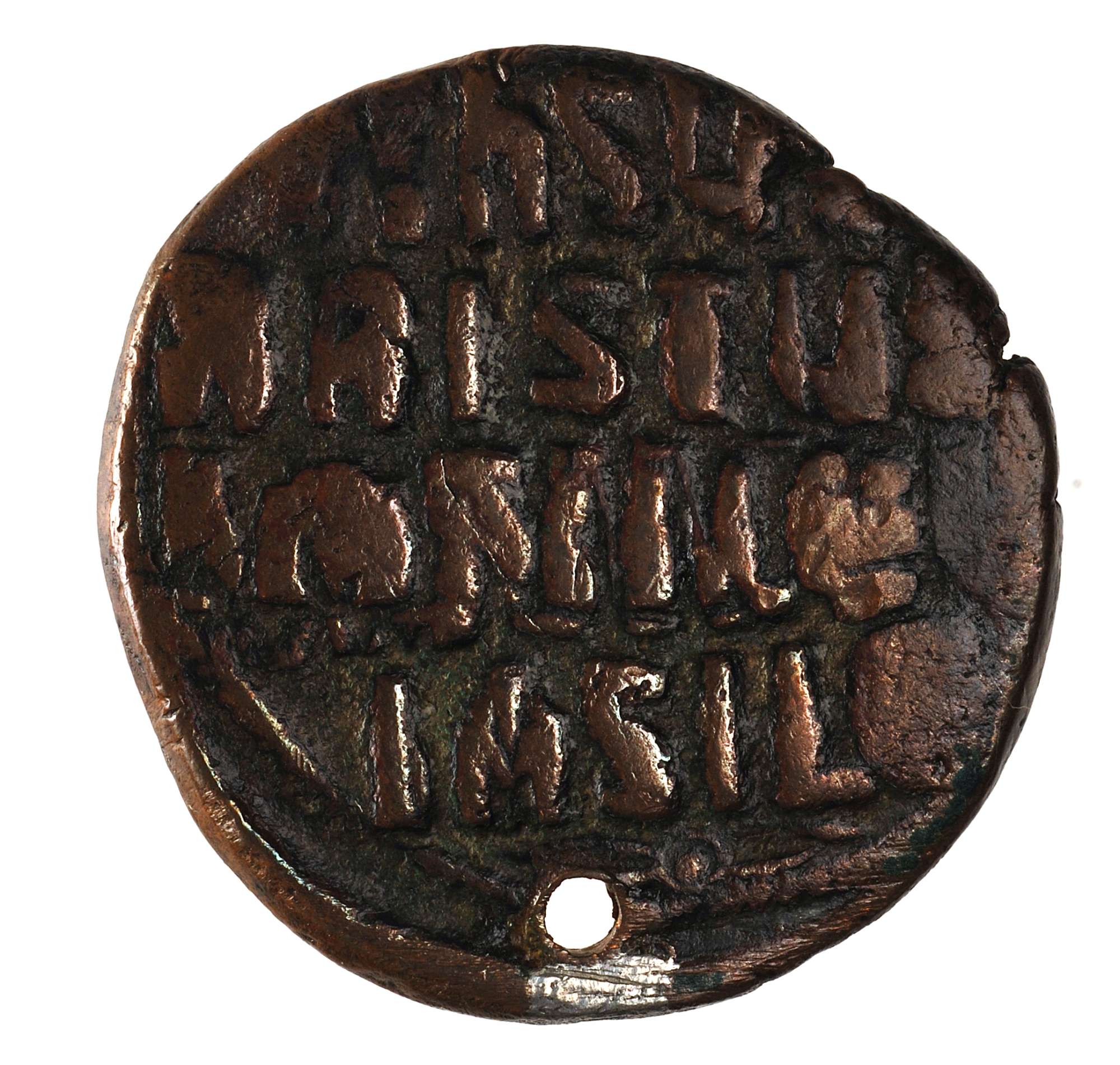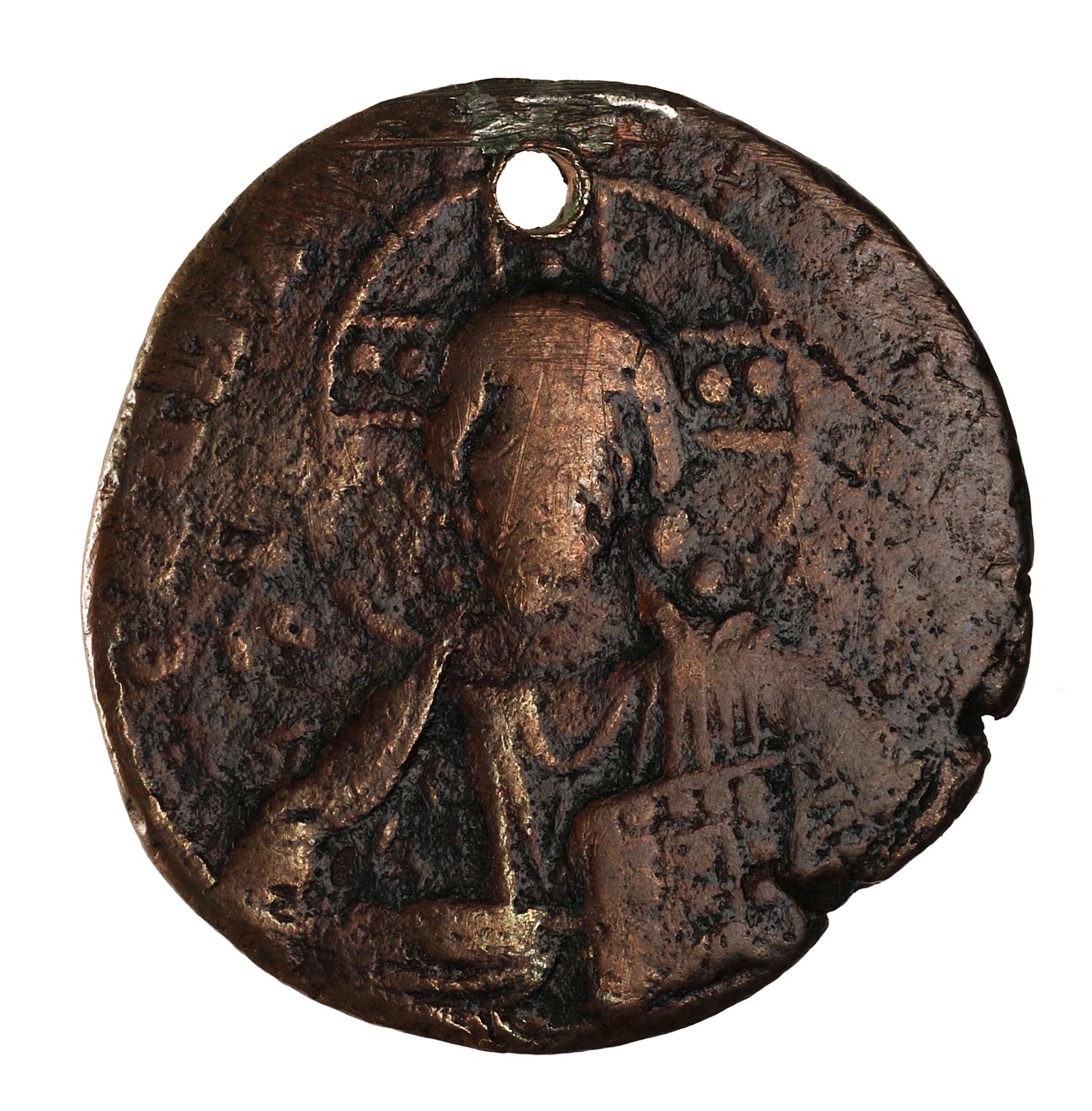 Dritto: Busto frontale di Cristo, con il capo nimbato, tiene il Vangelo nella s. Nel campo, a s., IC, a d., XC