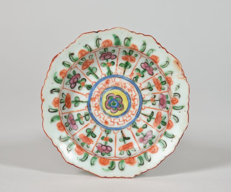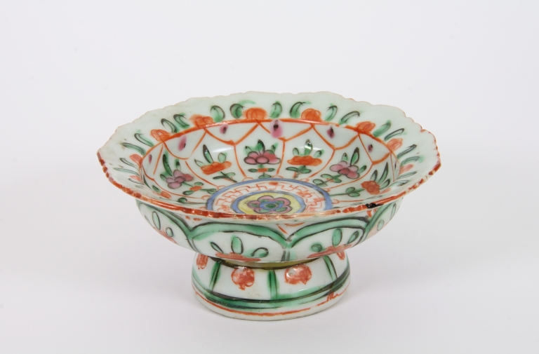 Piatto ad orlo everso con labbro polilobato, su piedistallo troncoconico, con decorazione di tipo bencharong ("cinque colori") a smalti policromi sopra coperta.