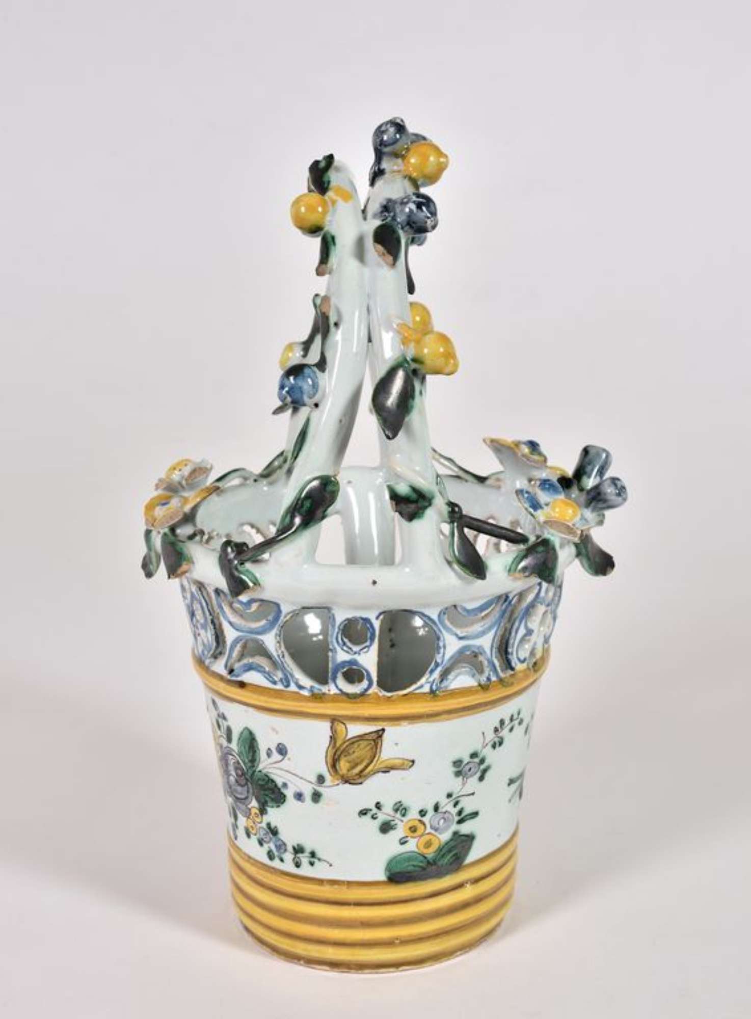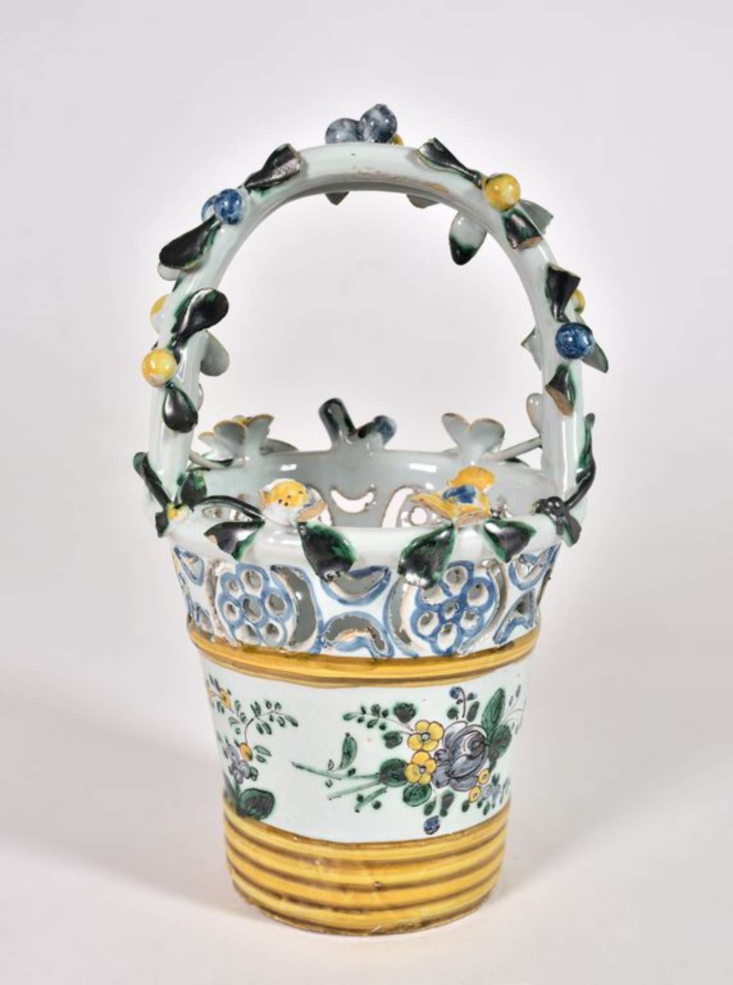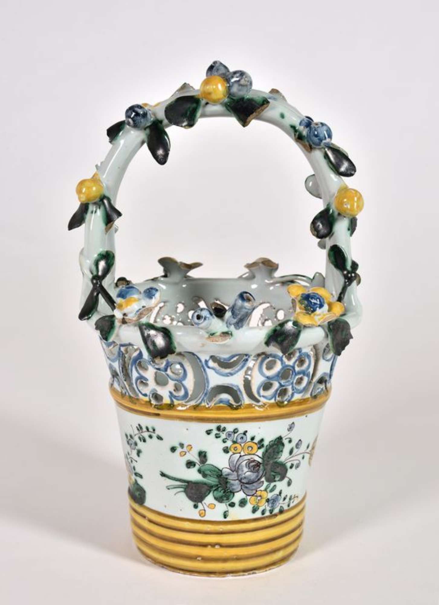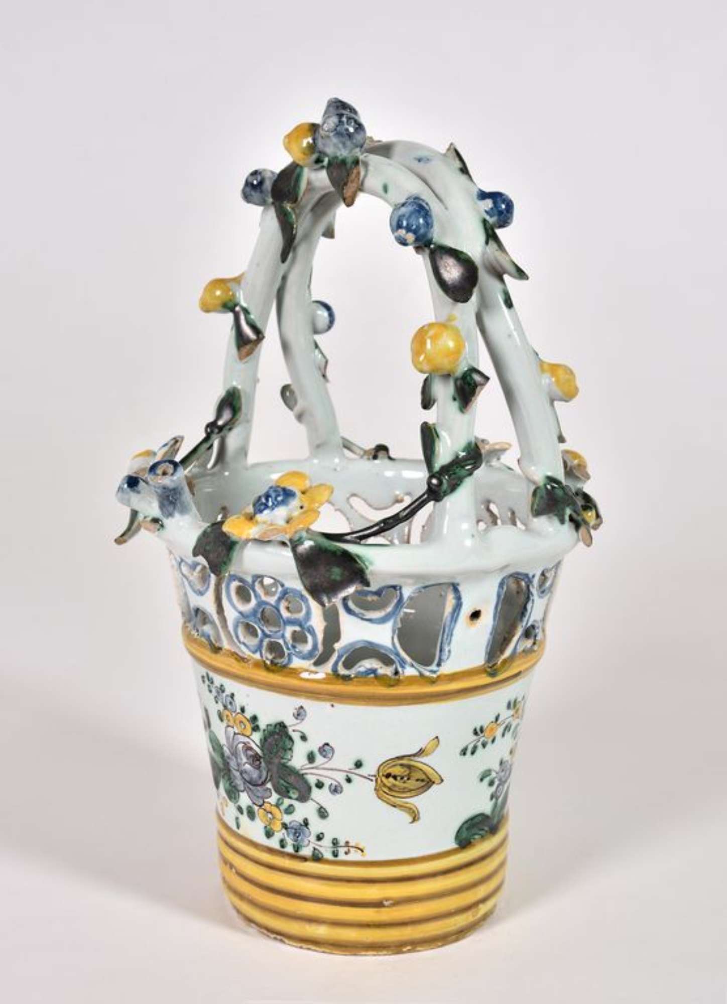 Vaso (bevi se puoi) a foggia di cestino con fascia traforata sotto all'orlo tubolare e manico a staffa. L'orlo del cestino è munito di due beccucci.