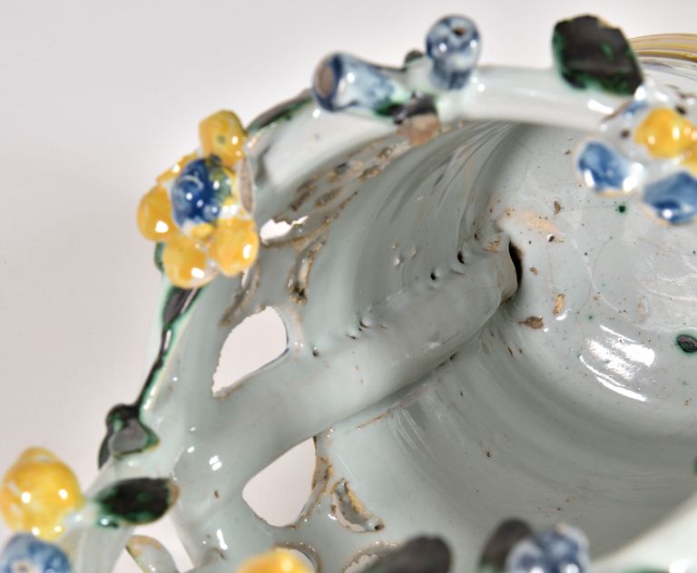 Larga fascia decorata a mazzi di fiori policromi dipinti e in rilievo; alla base, scanalature gialle e brune; sul manico a doppio tubo, frutta e fiori policromi applicati in rilievo.