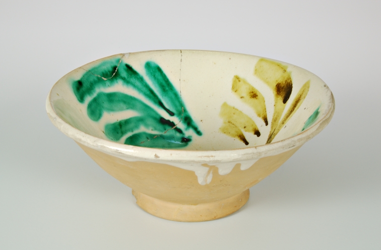 Forma circolare su base cercinata con parete espansa. L’interno presenta una decorazione con 4 larghe foglie a ventaglio nei colori alternati verde e giallo. L’esterno è privo di rivestimento.