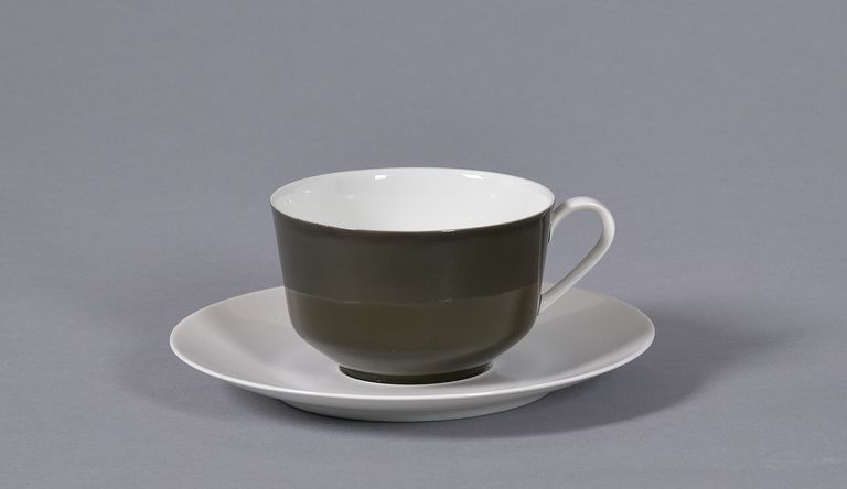 Tazzina da té ansata del servizio "Arzberg 2200". Esterno di colore grigio-verde scuro. Interno e manico in bianco.