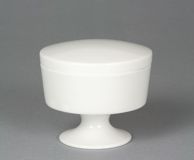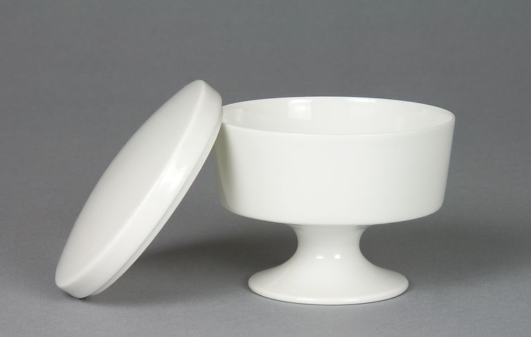 Zuccheriera in porcellana bianca per servizio da té, a corpo cilindrico, su piede, con coperchio.
