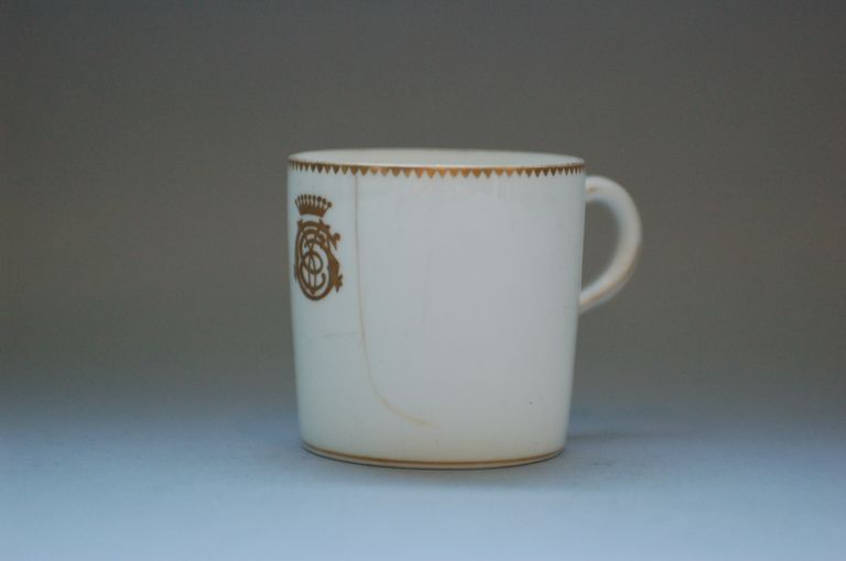 Tazza cilindrica in porcellana bianca con dentellatura al bordo superiore e filettatura al piede dorate Sempre in oro le cifre di Mario Gigliucci (1847-1937) e di Edith Margaret Mozley (1847 – 1909).