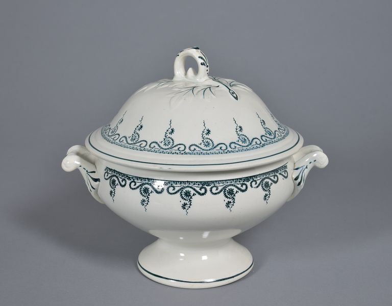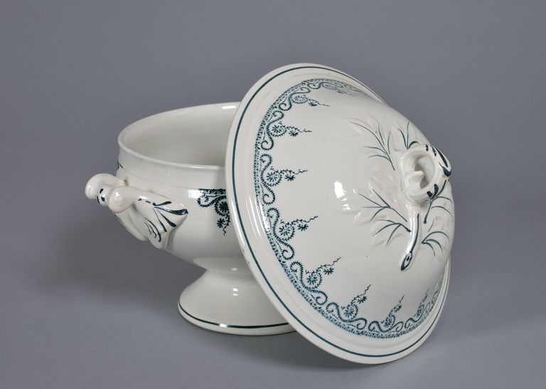 Di forma circolare, a corpo espanso su alto piede svasato. Due anse orizzontali, diametralmente contrapposte sono situate nel punto di massima espansione del corpo. Coperchio a cupola con presa circolare a protome fitomorfa all'apice su foglia in leggero rilievo. Decoro all'esterno: sul bordo sia della zuppiera che del coperchio, si dispone una sequenza composta da un corta fascia a zig-zag, con triangolini nei settori di risulta, su questa poggia un tralcio fogliato con fiori stilizzati e viticci; i rilievi sono evidenziati da veloci pennellate. Sottili filetti sono posizionati sul bordo del piede e al bordo del coperchio. Impasto di colore bianco foggiatura a colaggio, vetrina trasparente decorazione a timbro (o tampone).