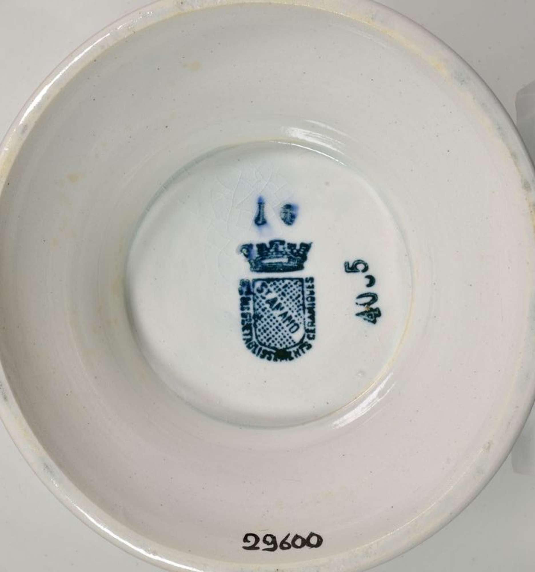 Sul fondo marca: stemma a scudo (diviso in banda, la prima e la terza a puntini, la seconda reca la scritta St Amand) sormontato da corona (di marchese?), attorno allo stemma scritta "…ceramiques". Dipinto in monocromia verde-nerastra.