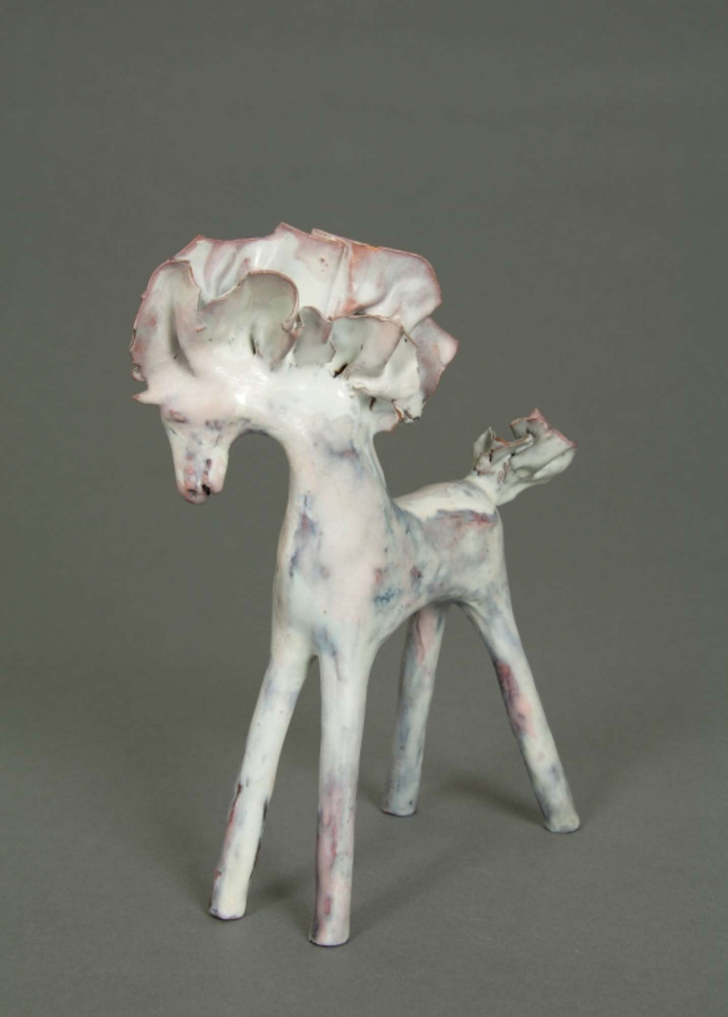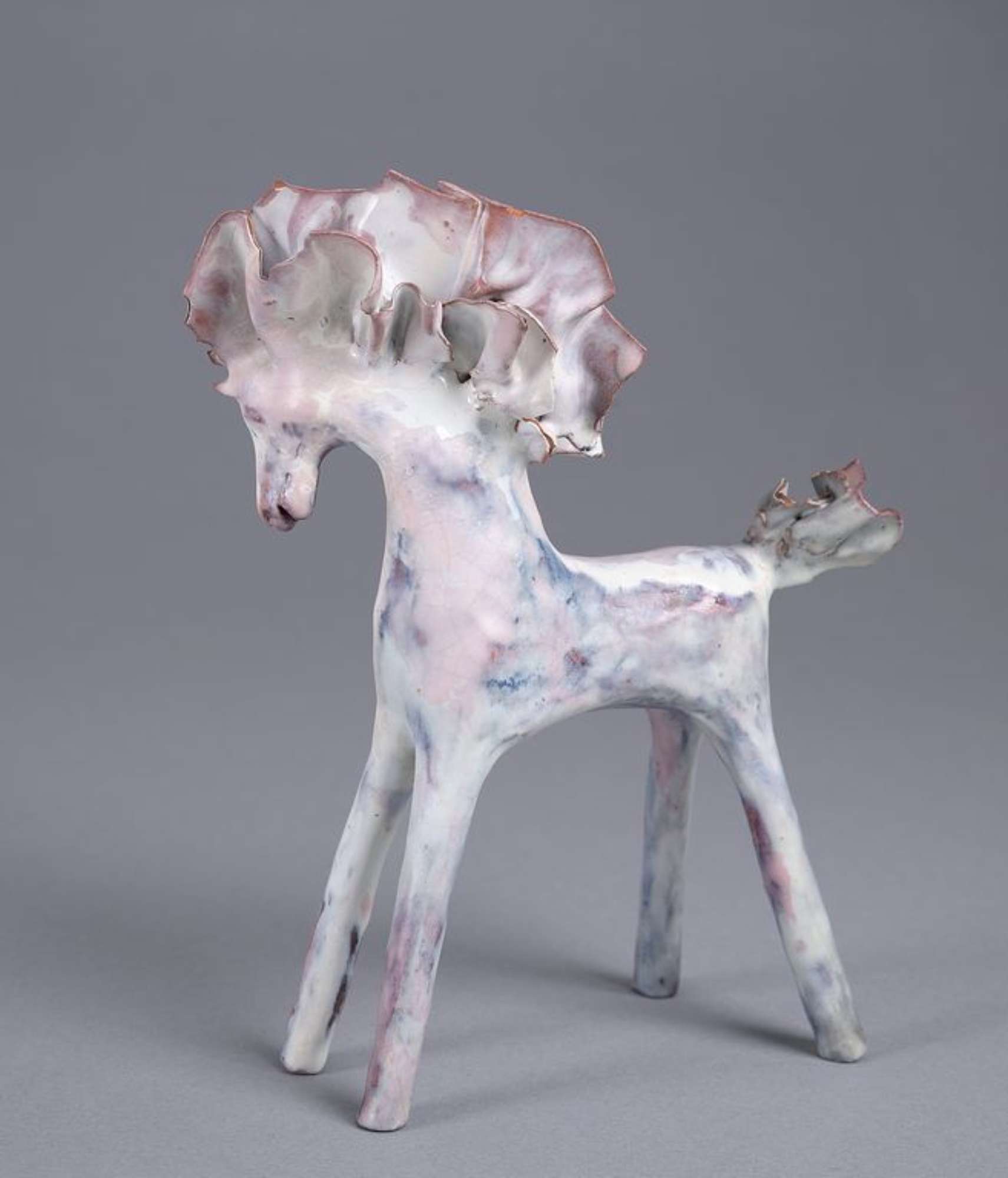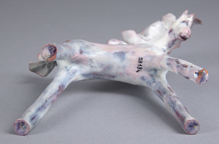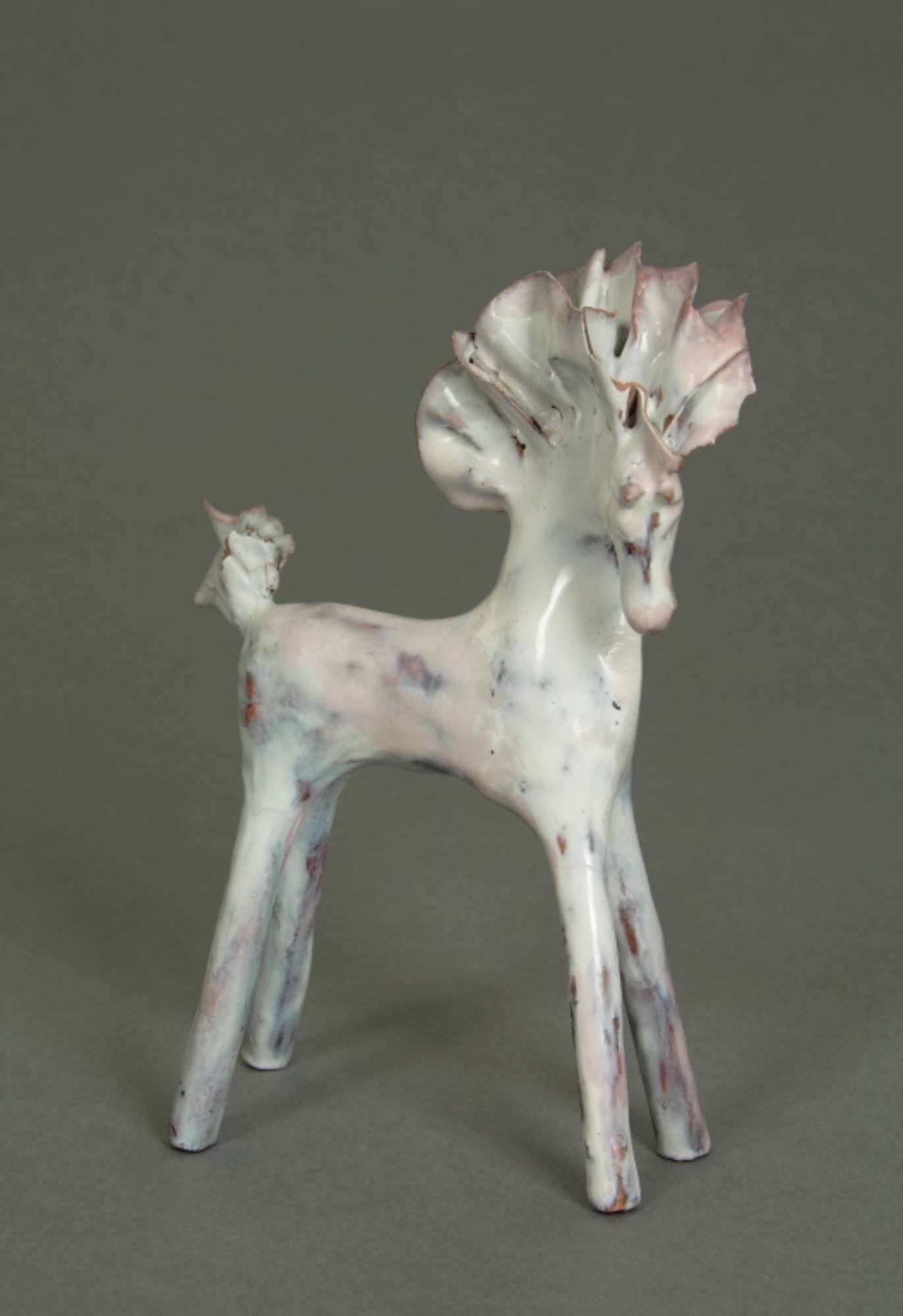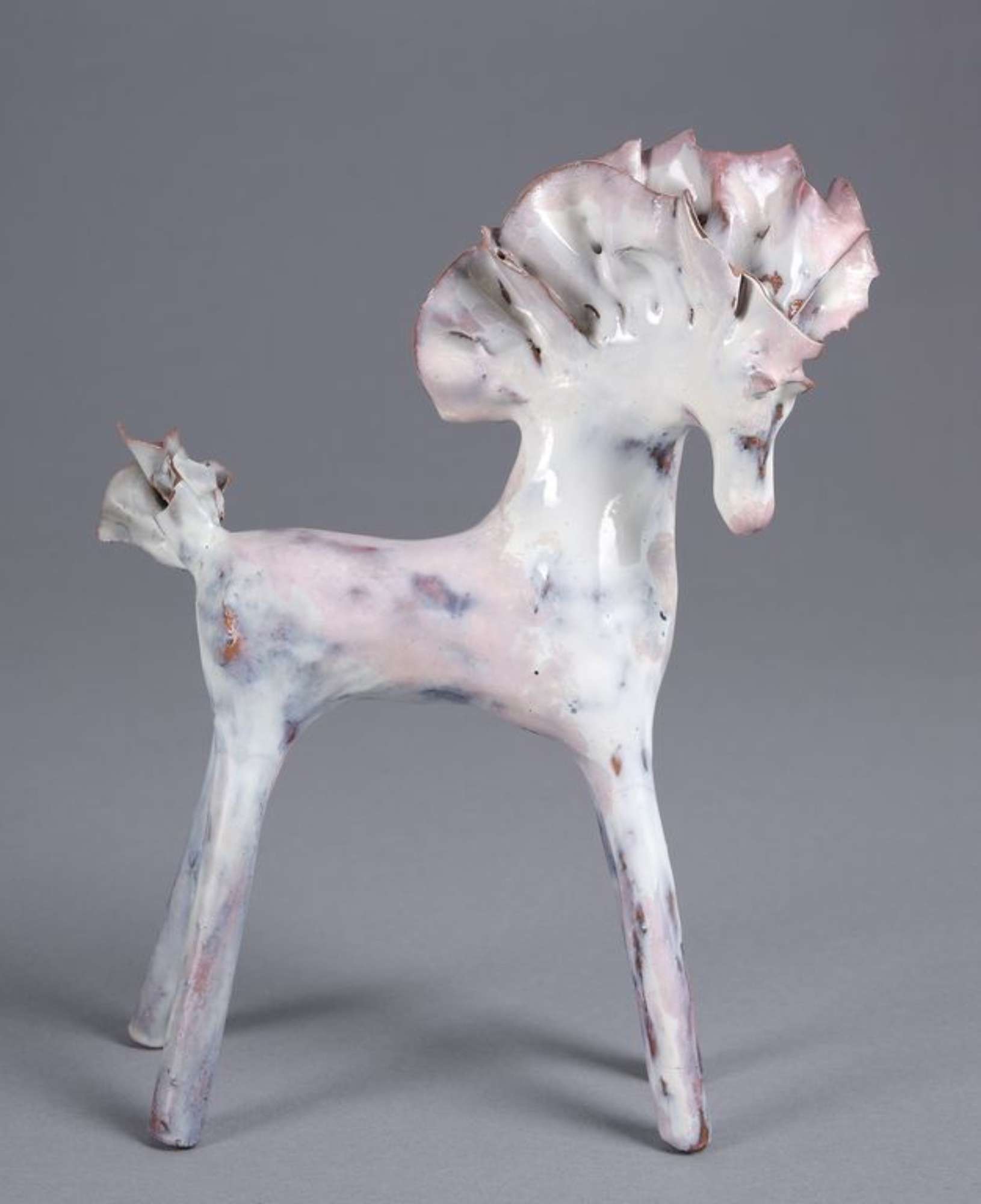 Piccola plastica raffigurante un cavallo con alta criniera e coda frastagliate. Lunghe gambe dritte e rigide: le anteriori protese in avanti e le posteriori protese all'indietro. Rivestito da uno smalto bianco disomogeo con sfumature rosate e bruno scuro, in alcuni punti trasparenze color cuoio.