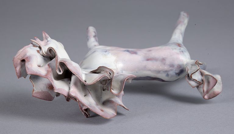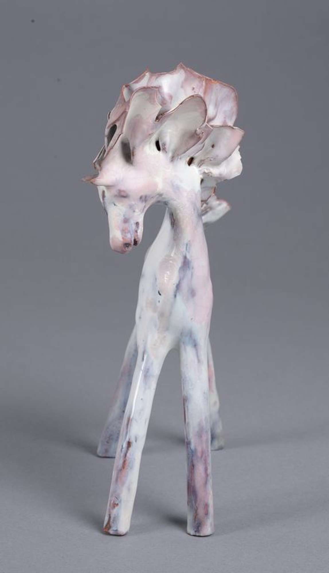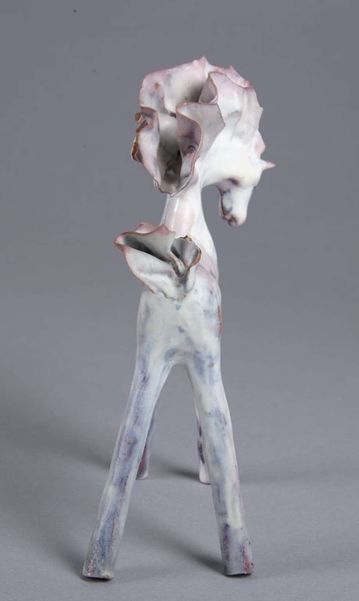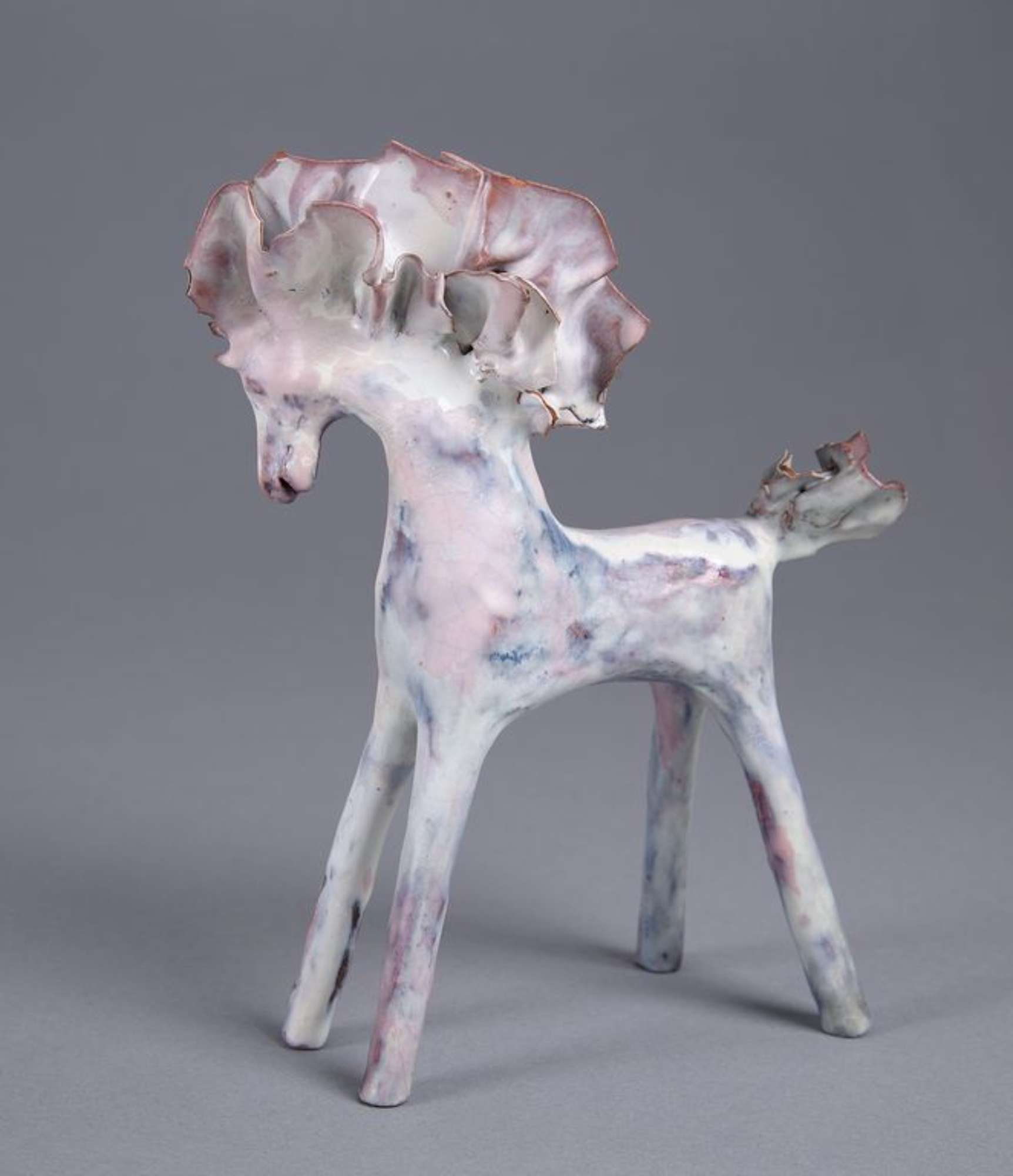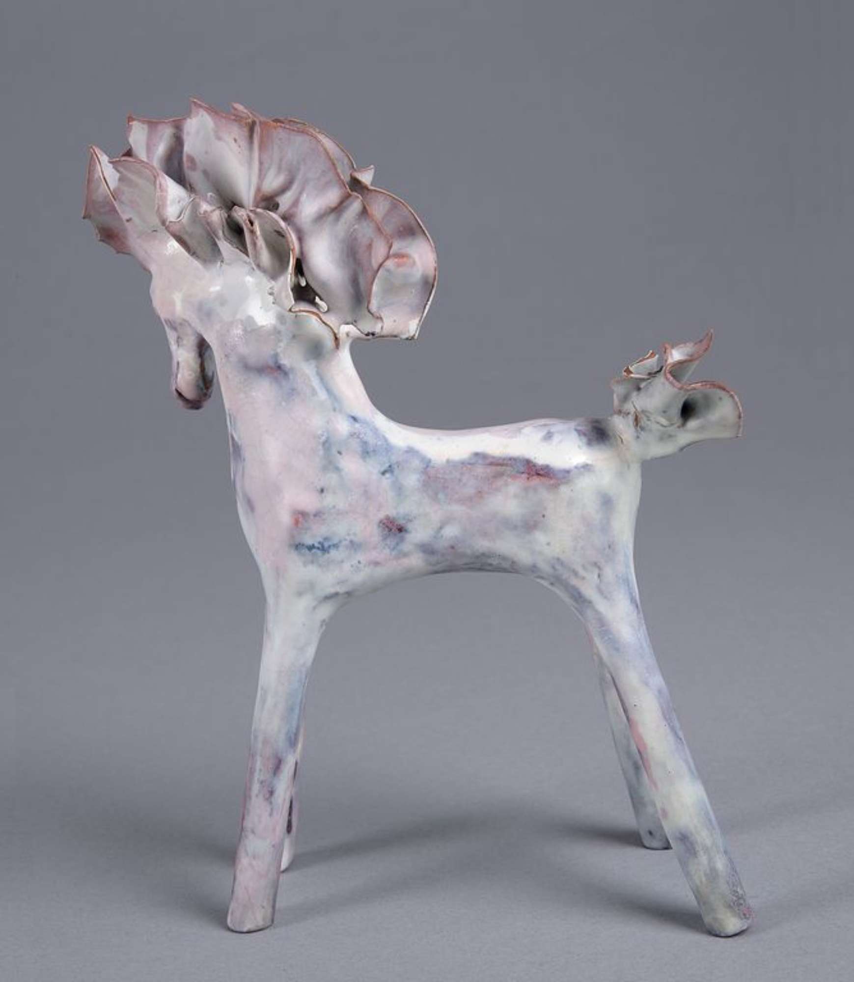 Piccola plastica raffigurante un cavallo con alta criniera e coda frastagliate. Lunghe gambe dritte e rigide: le anteriori protese in avanti e le posteriori protese all'indietro. Rivestito da uno smalto bianco disomogeo con sfumature rosate e bruno scuro, in alcuni punti trasparenze color cuoio.