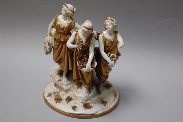 Gruppo in porcellana bianca con ampie dorature che rappresenta, unitamente ad un amorino e su una base rocciosa con numerose pigne d'usa anch'esse dorate, le allegorie di tre personaggi della mitologia greca: Crere, Pomona e Flora.