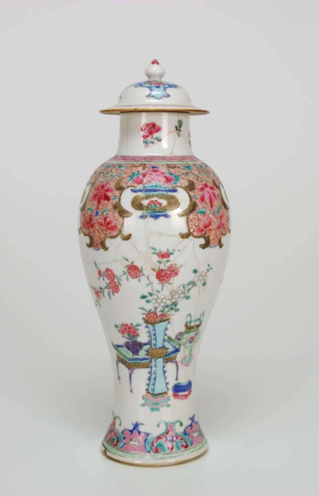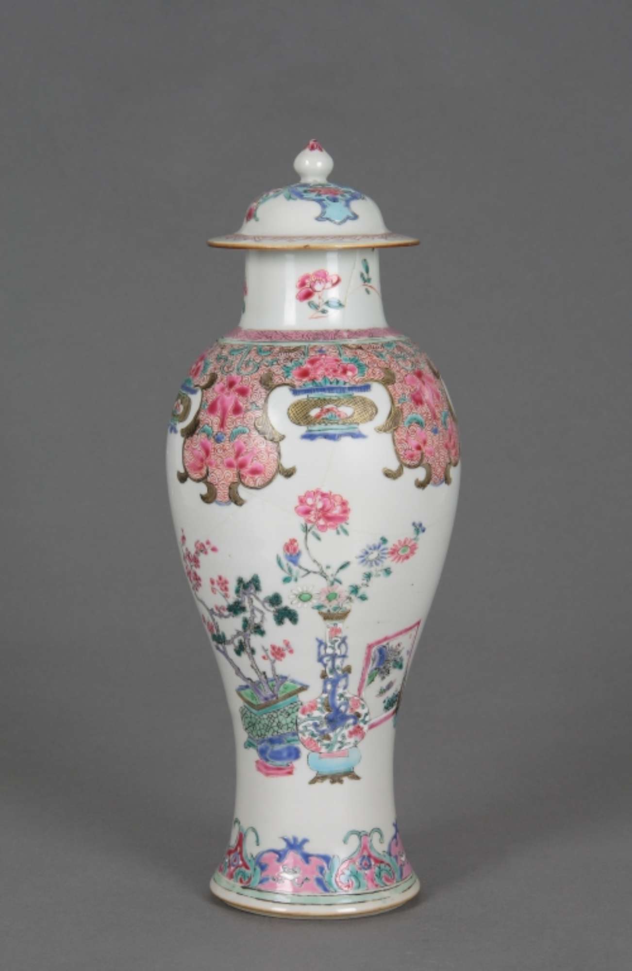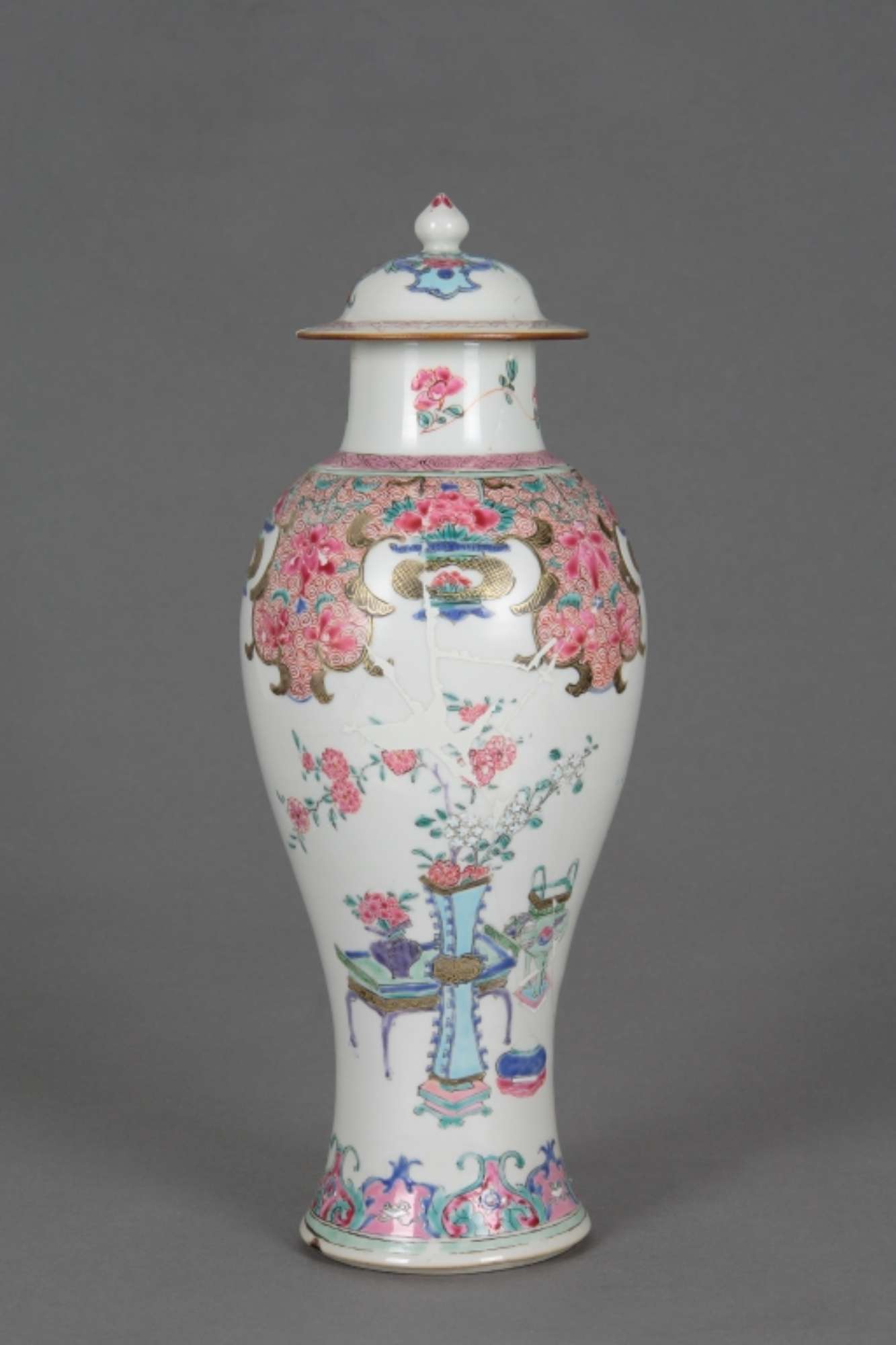 Vaso “a colonnina di balaustra”, della tipologia fencai (famiglia rosa), con tozzo collare cilindrico su cui alloggia il coperchio a calotta con larga tesa e pomello “a bocciolo di loto”.
