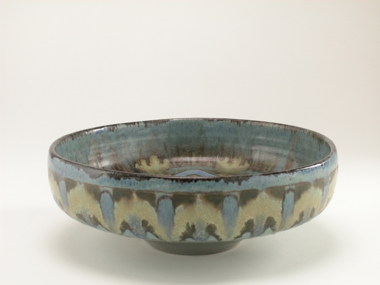 Ciotola a bordo rialzato con piccolo cavetto, su basso piede, smaltata in azzurro semi lucido. Decorata con motivi geometrici turchesi e screziature in giallo bruno. Nel cavetto è dipinto un muso di gatto (o di volpe?).