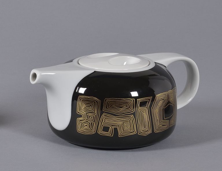 Teiera ansata a parete cilindrica rastremata alla base con coperchio leggermente bombato dove sono ricavate due cavità ovali che fungono da presa digitale. Sulla superficie, ad eccezione del beccuccio, del manico e del coperchio, corre una fascia nera con inscritta una decorazione geometrica filiforme in oro. Fa parte del servizio da tavola "Delta Quadro Gold". Sul fondo marca di fabbrica stampigliata in verde.