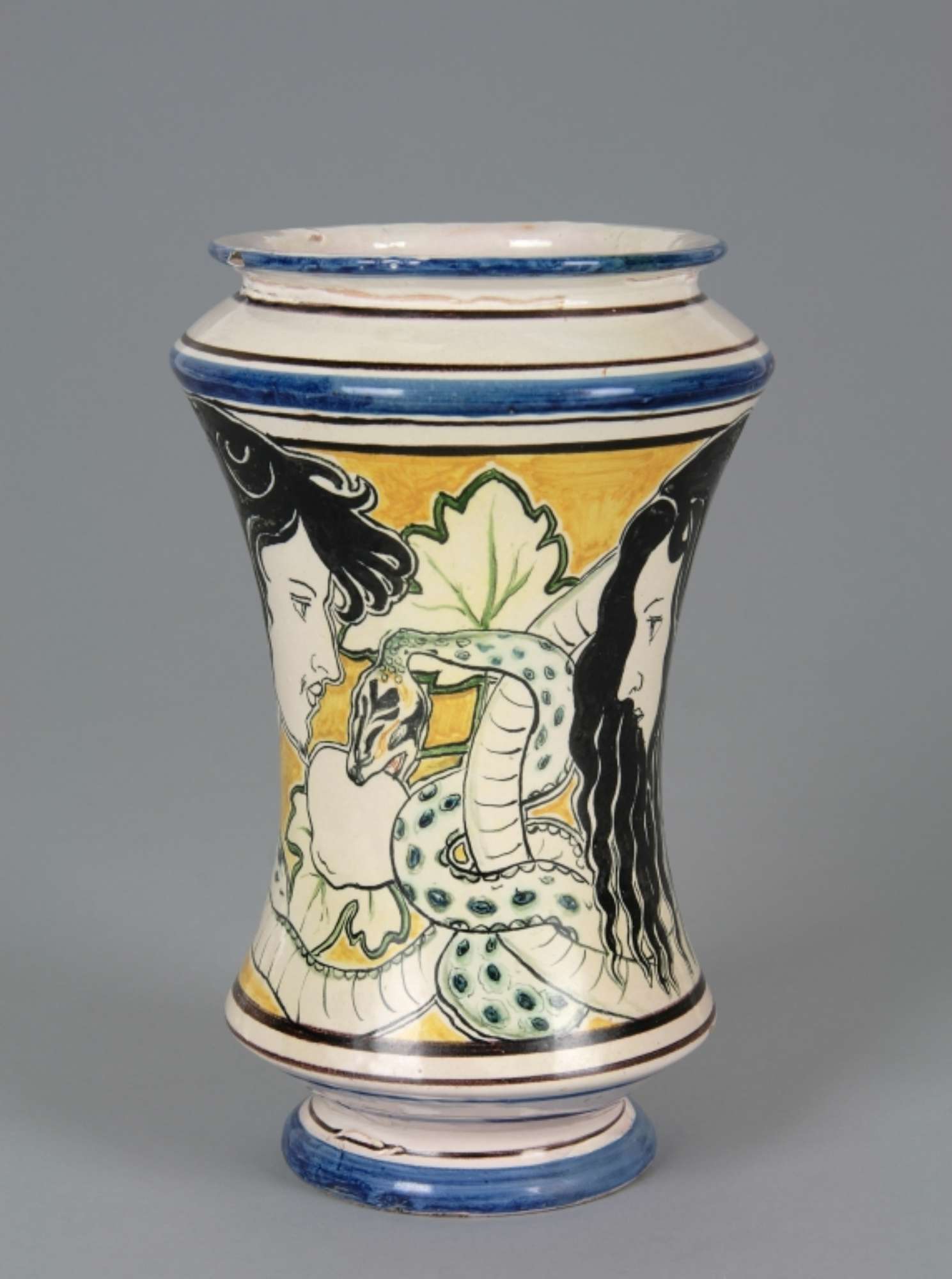 A parete concava, rastremato sia inferiormente, sia superiormente, con piede ed orlo svasato. Nella parte centrale scena biblica del "Peccato Originale". Righe alla base ed al bordo. Dipinto in blu, nero, giallo, marrone e paglierino. Non marcato.