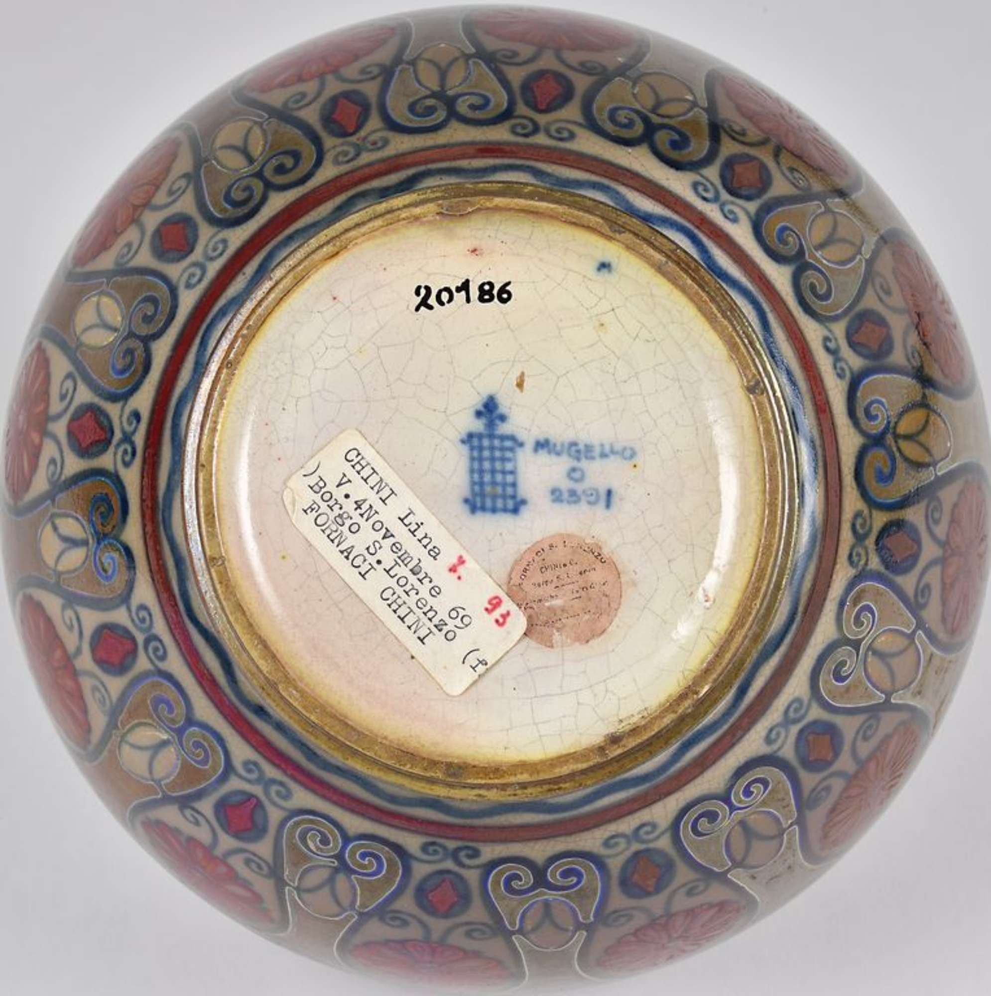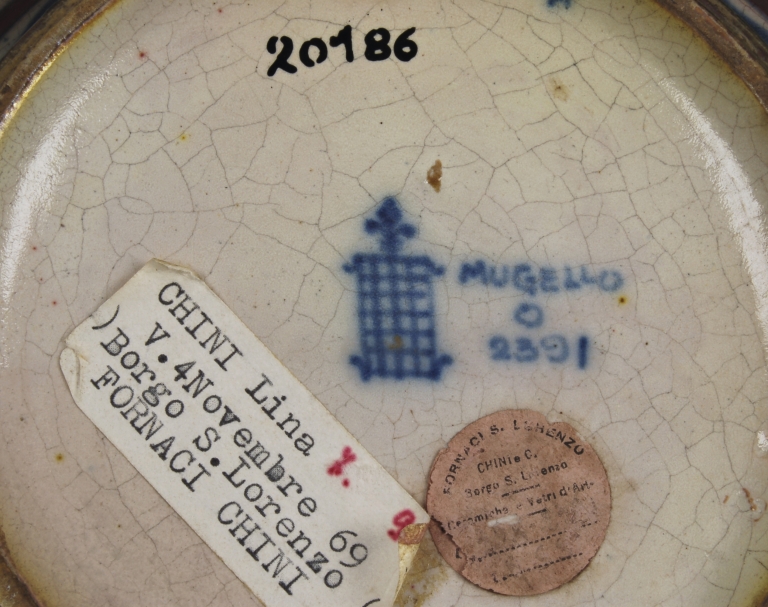 Etichetta circolare della fabbrica, vicino al marchio, in carta chiara, con scritta:"FORNACI S.LORENZO. CHINI E Co. BORGO S.LORENZO. CERAMICHE E VETRI", in nero.