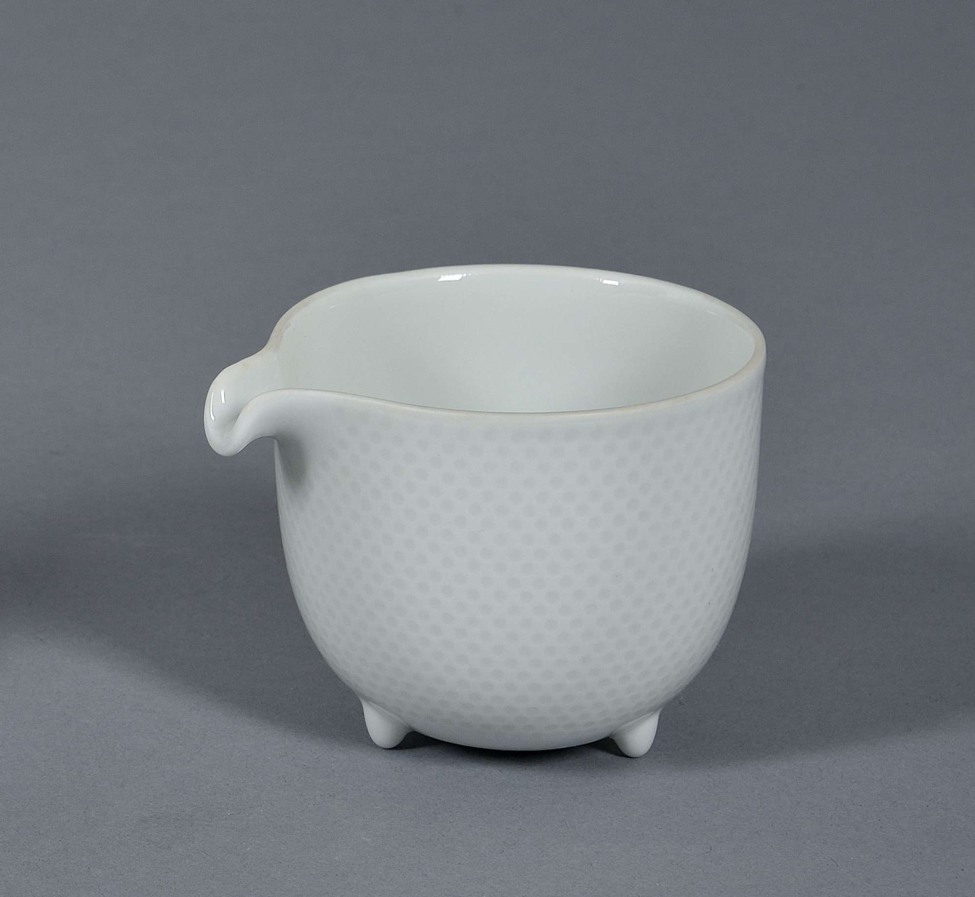 Lattiera del servizio "Century": forma concava poggiante su tre piedini. Decorato a puntolini lievemente impressi fittissimi, all'esterno. Sul fondo marca stampigliata in verde.