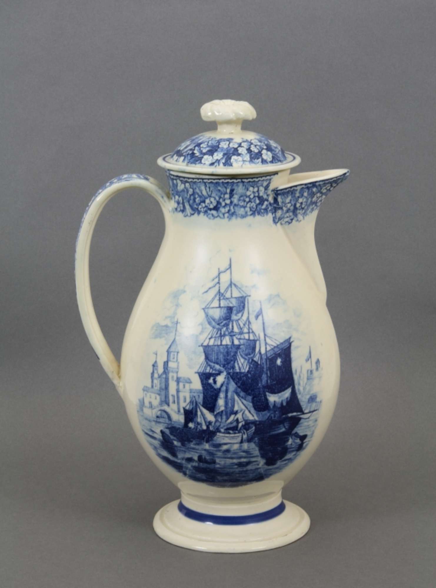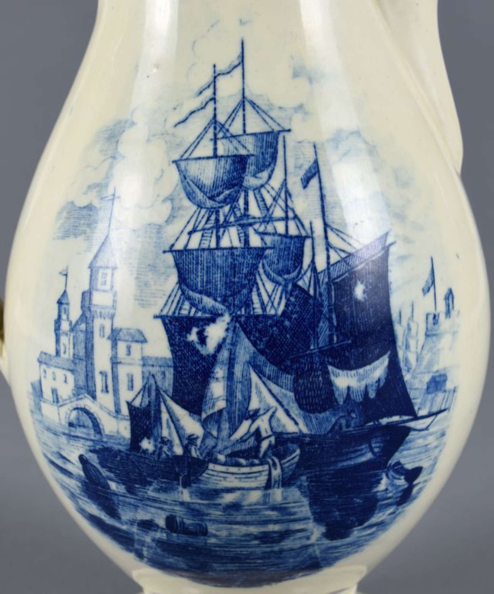 Lateralmente due vedute di un porto con velieri; all'orlo motivi floreali. Monocromia turchina a decalcomania.