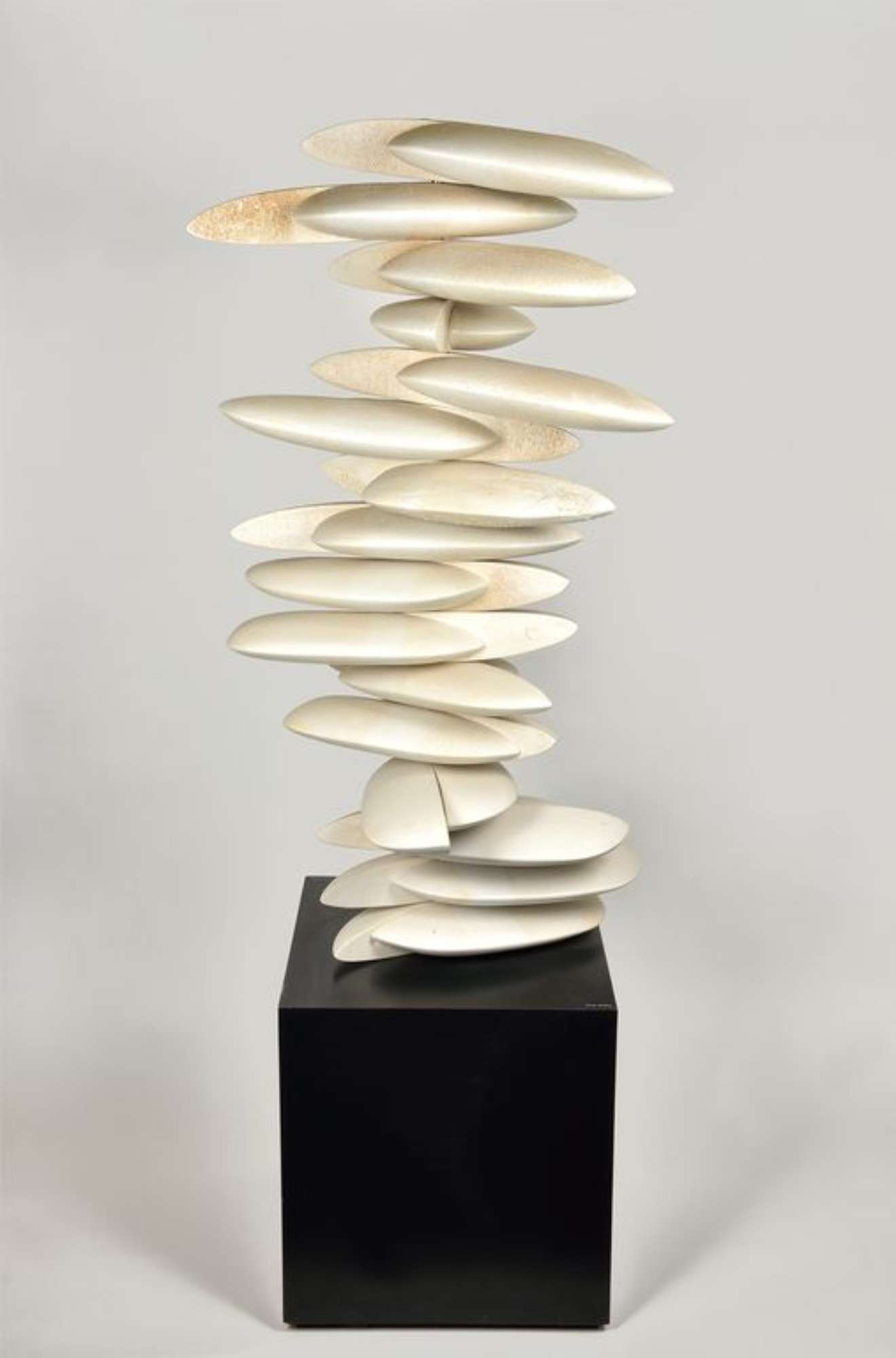 L'opera, dall'aspetto dinamico e verticale, è formata da sedici elementi modulari dalla forma ogivale bipartita e attaccati in modo sfalsato, posti su una base nera. Ogni elemento orizzontale è sovrapposto in modo da produrre un effetto dinamico. Colore bianco matt con sfumature puntinate in colore ruggine. Firmata in basso.