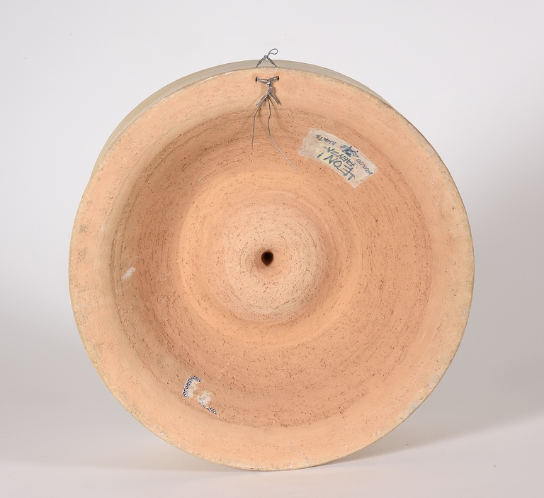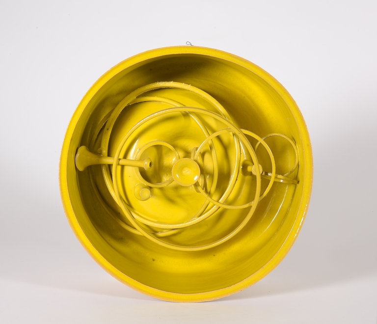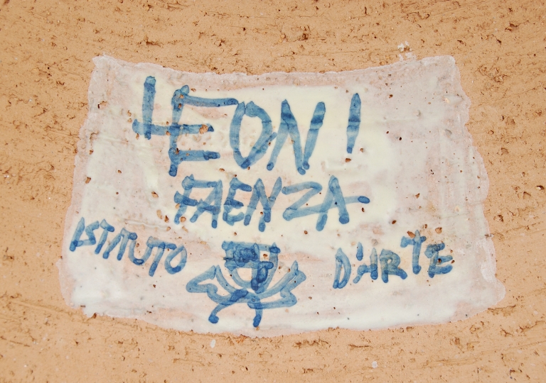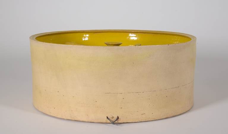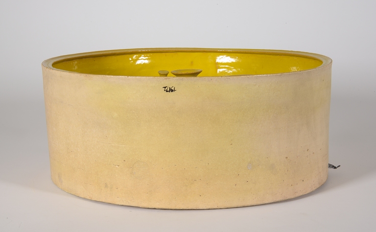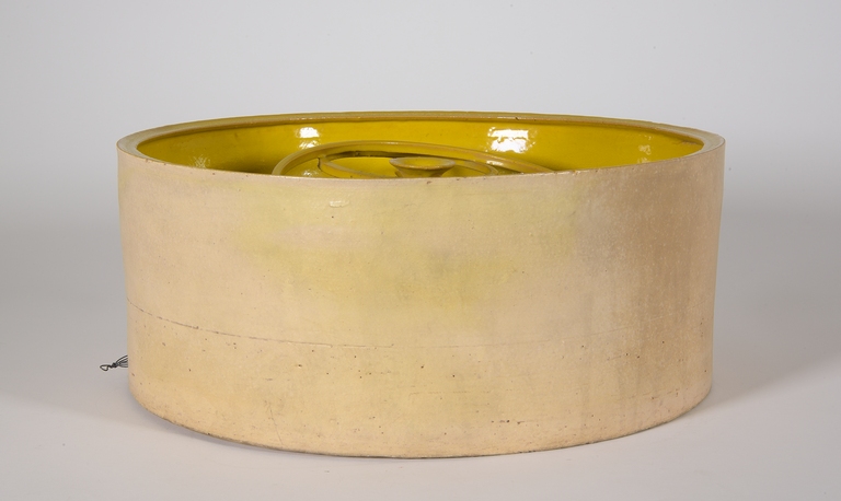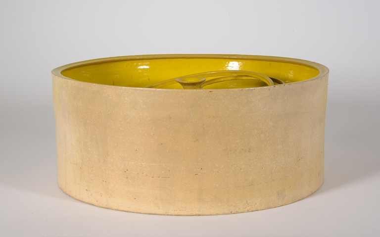 Contenitore a forma cilindrica con all'interno scarti di produzione ceramica. Smalto giallo all'interno e vetrina all'esterno. Firmato nel retro LEONI FAENZA e la marca dell'Istituto d'Arte.