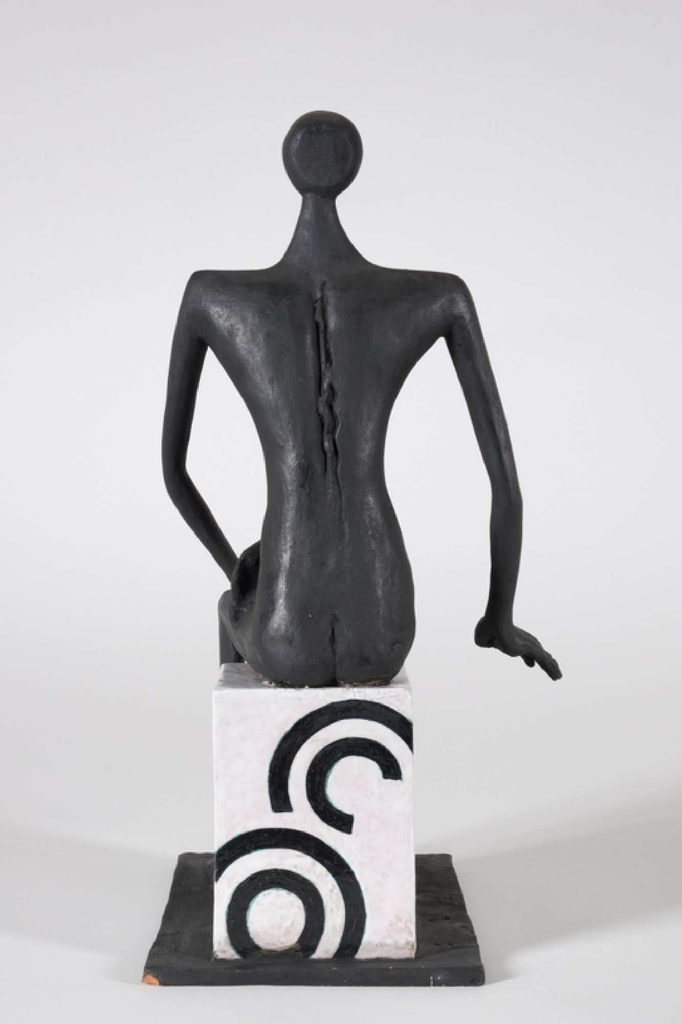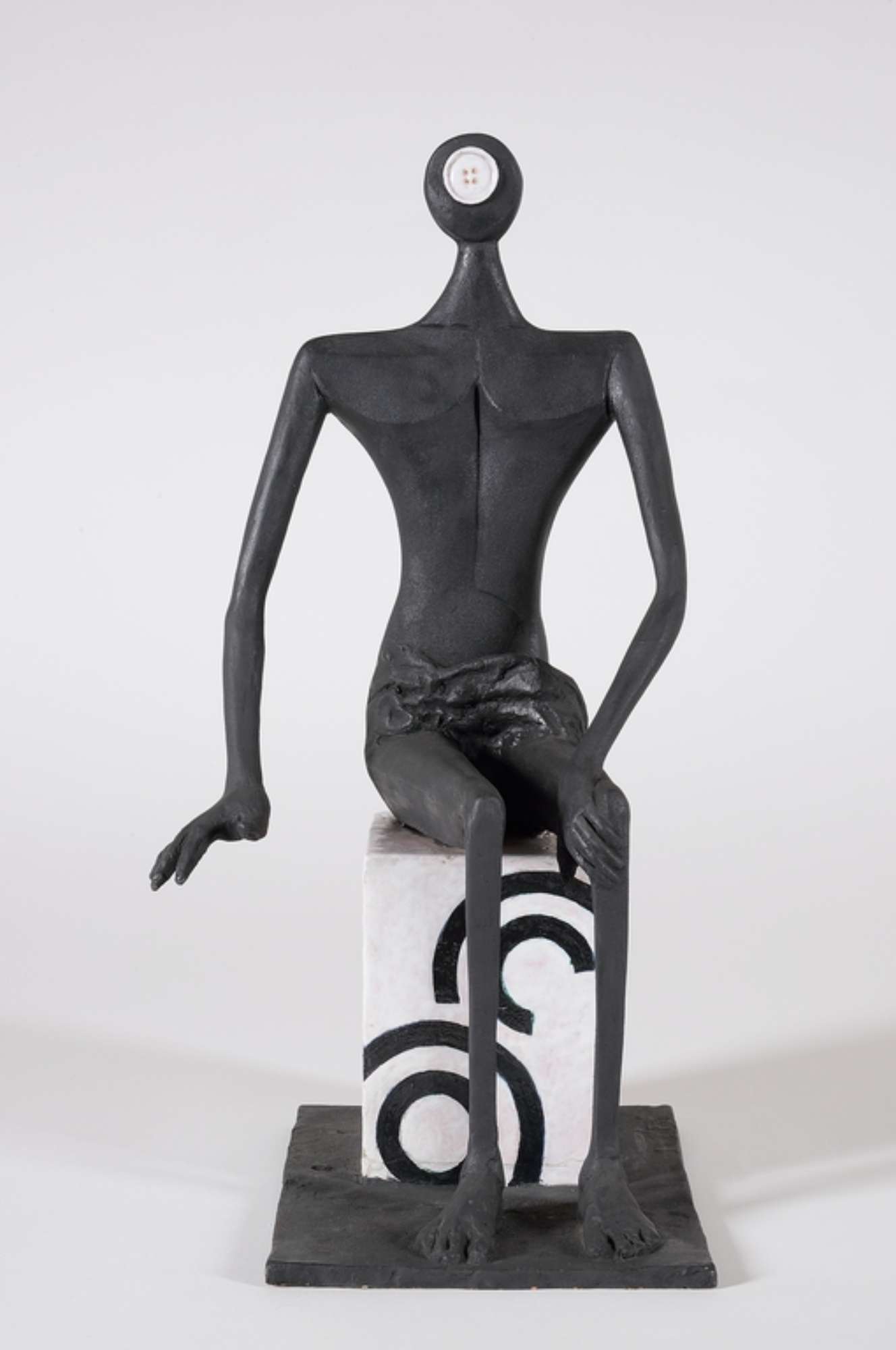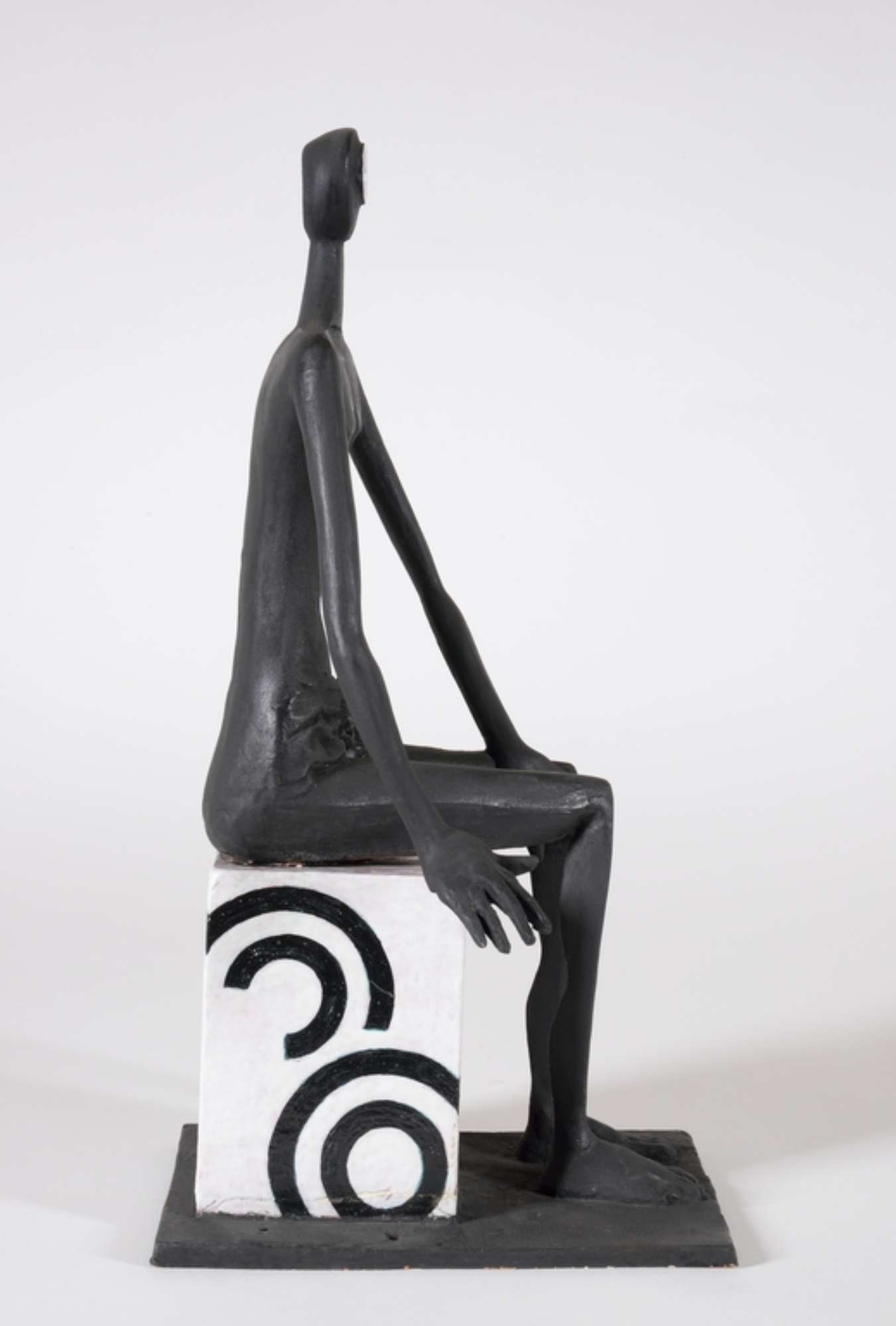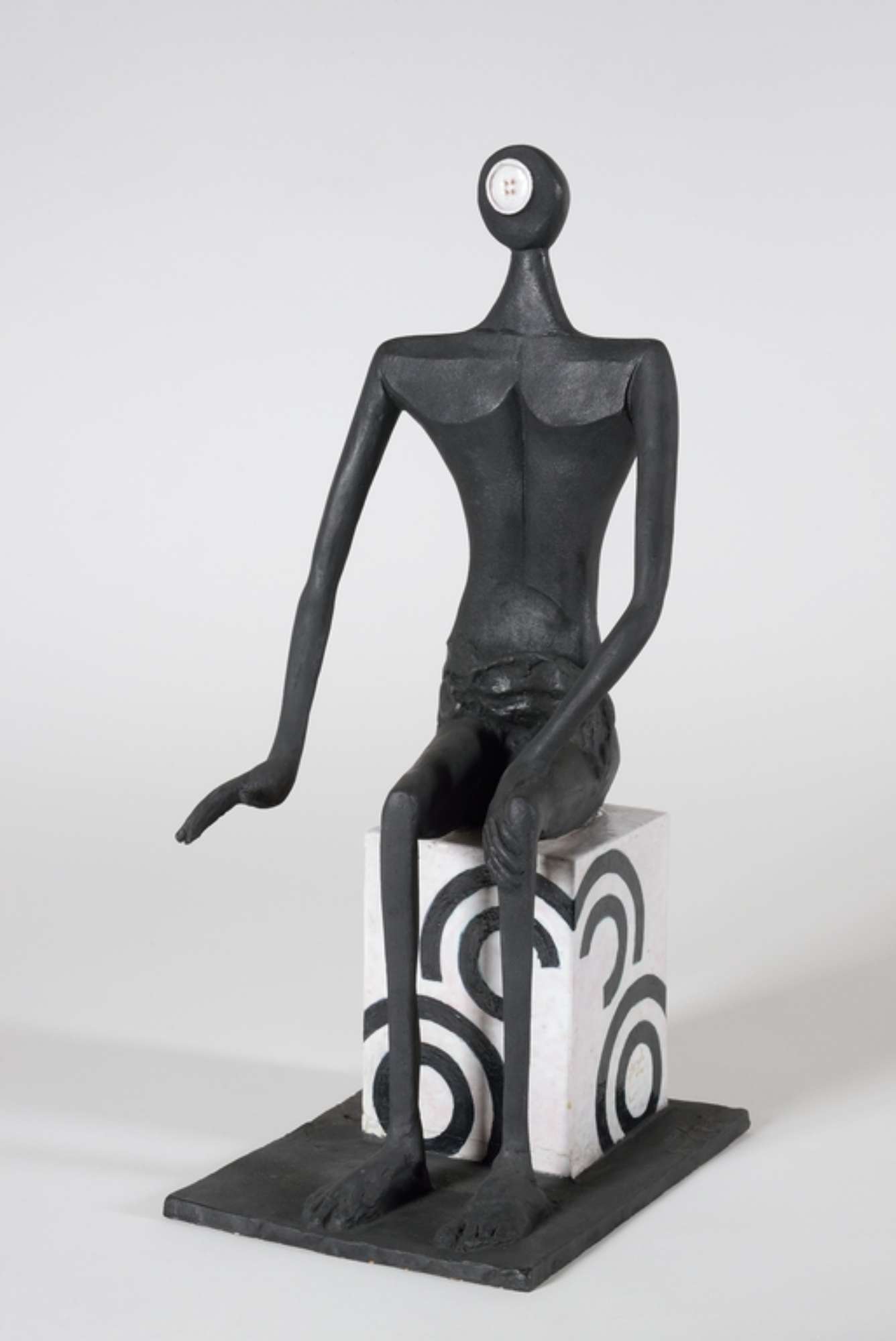 Figura antropomorfa seduta su cubo bianco con disegni circolari neri.