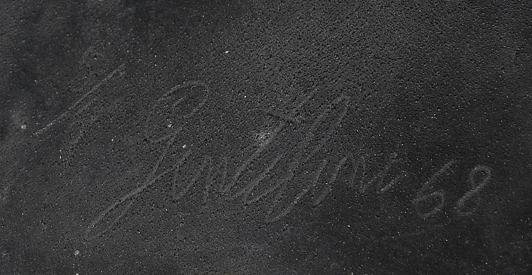 Al posto del viso è inserito un bottone bianco con quattro fori, mentre l'esile corpo è smaltato in nero. Firmato e datato sulla base "5/6 Gentilini 68".