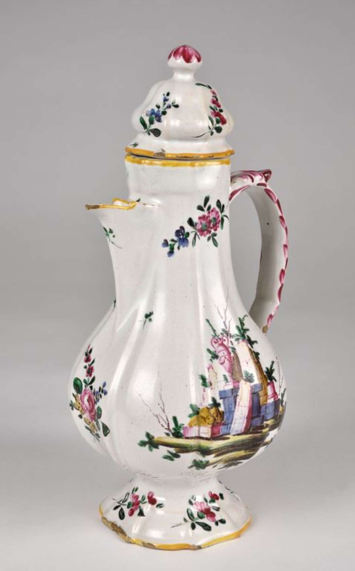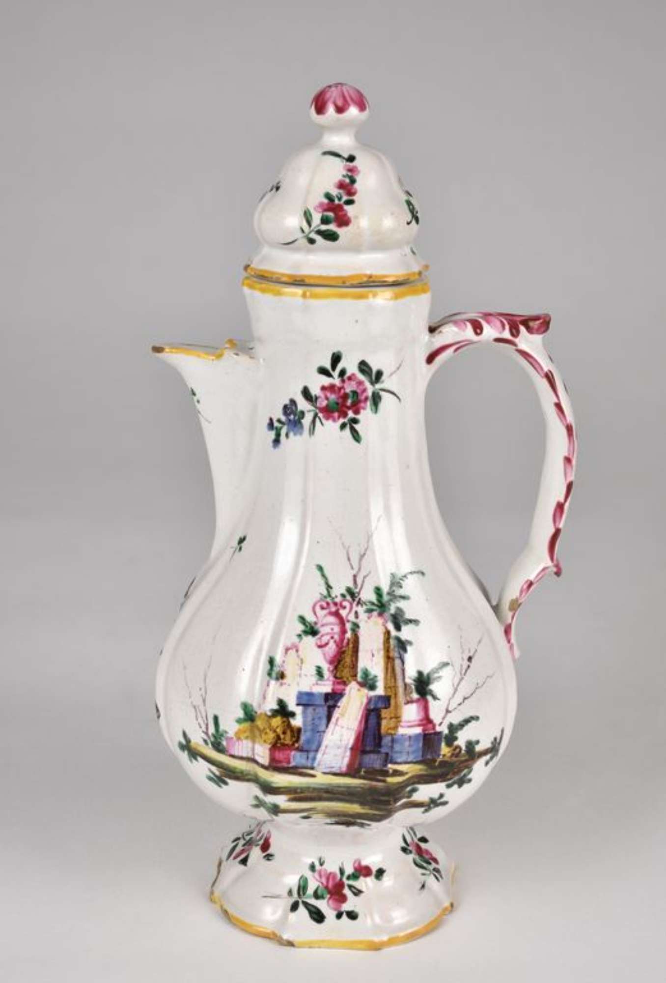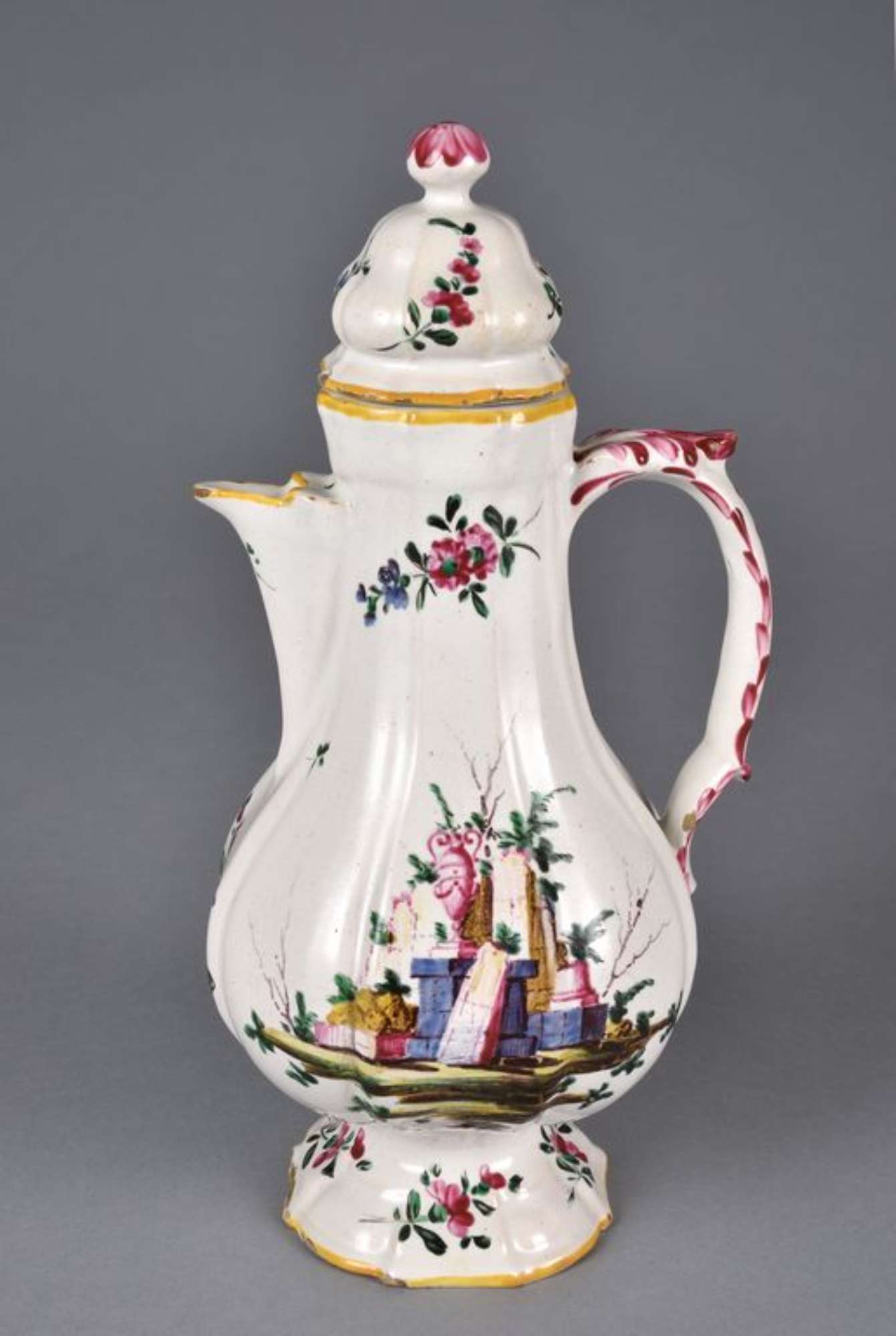 La caffettiera è decorata, su entrambi i lati, con il motivo detto a "rovine" composto da larghi blocchi di mura diroccati, colonne spezzate e un'anfora. Nella restante superficie e nel coperchio si dispongono rametti fioriti. Gli orli sono profilati in giallo; l'ansa è decorata da piccoli motivi fitomorfi e da veloci pennellate; il pomo è decorato da larghe pennellate radiali. Decorazione a pennello, a piccolo fuoco in blu, bruno, giallo, rosso porpora e verde su smalto bianco grigiastro.