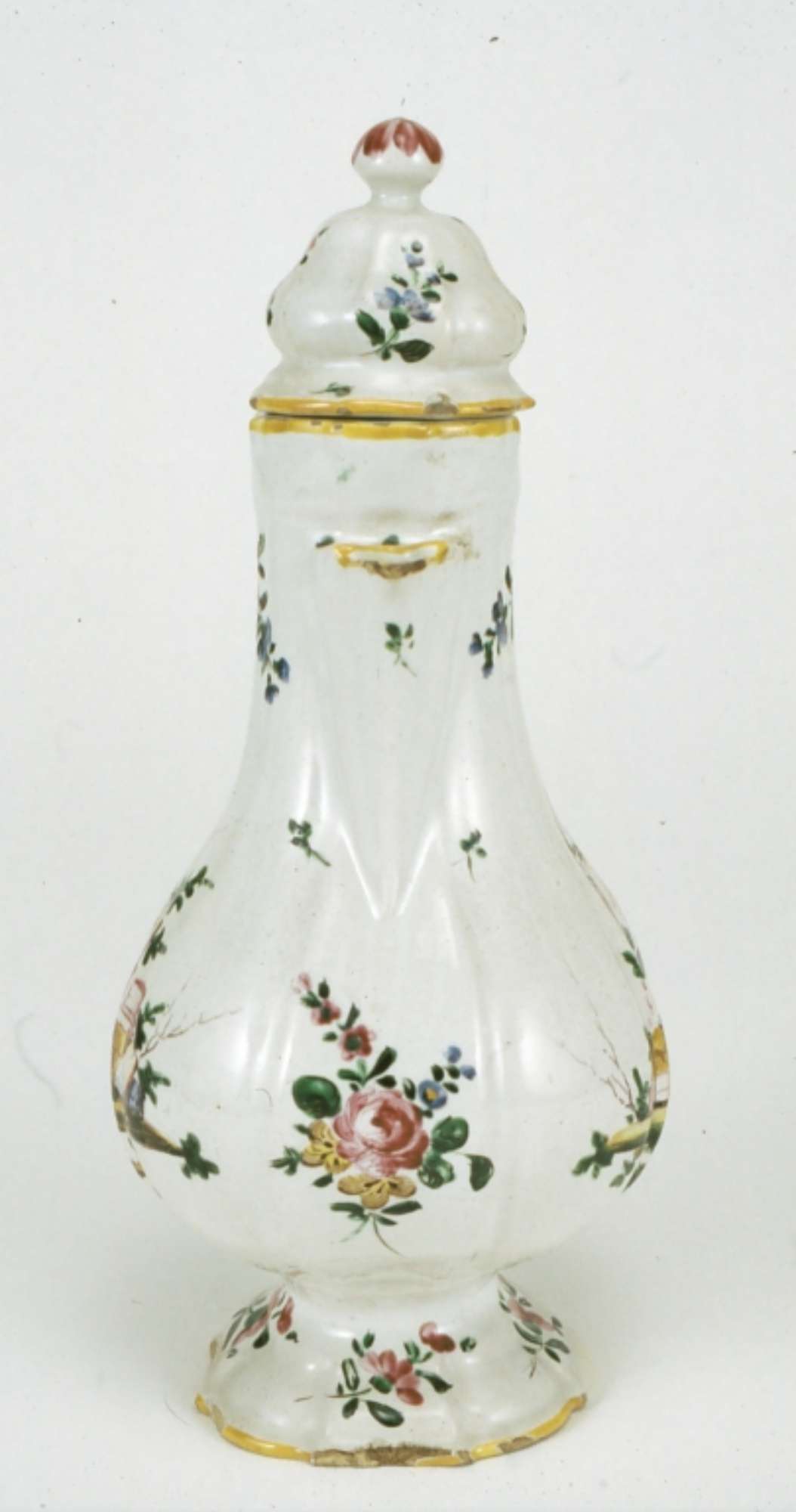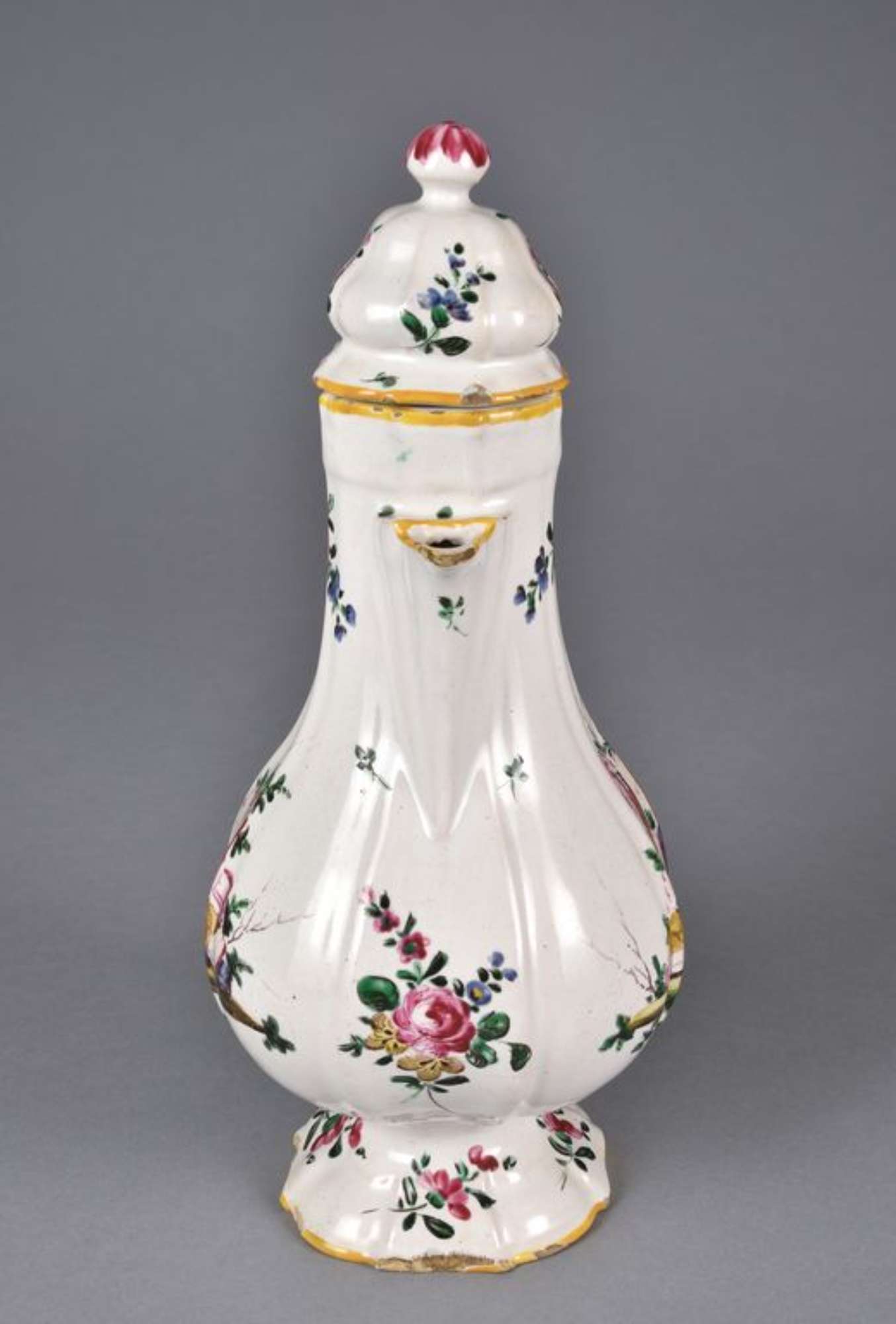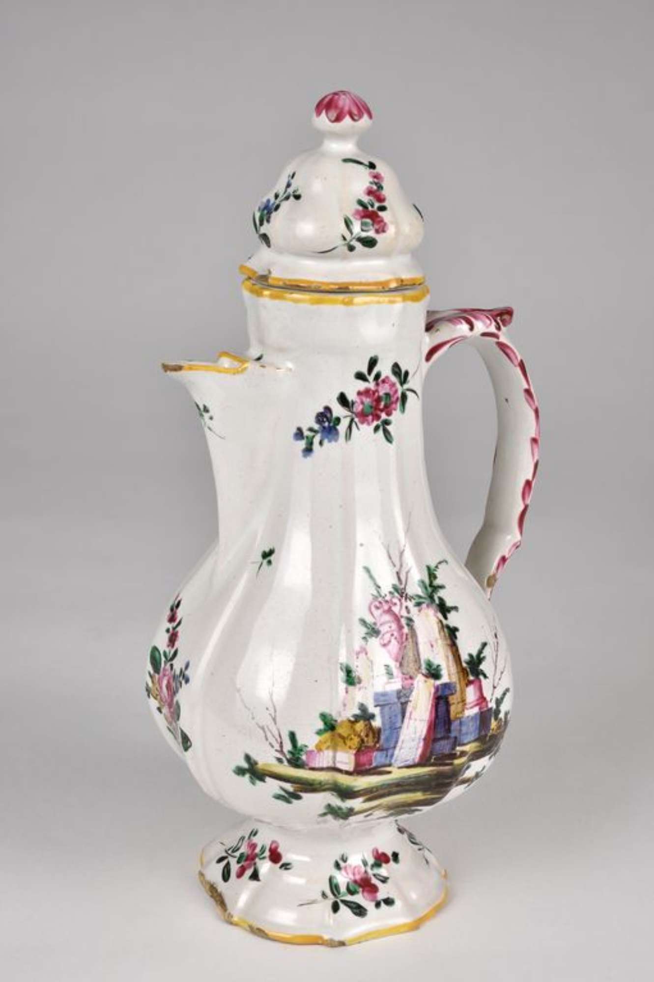 La caffettiera è decorata, su entrambi i lati, con il motivo detto a "rovine" composto da larghi blocchi di mura diroccati, colonne spezzate e un'anfora. Nella restante superficie e nel coperchio si dispongono rametti fioriti. Gli orli sono profilati in giallo; l'ansa è decorata da piccoli motivi fitomorfi e da veloci pennellate; il pomo è decorato da larghe pennellate radiali. Decorazione a pennello, a piccolo fuoco in blu, bruno, giallo, rosso porpora e verde su smalto bianco grigiastro.
