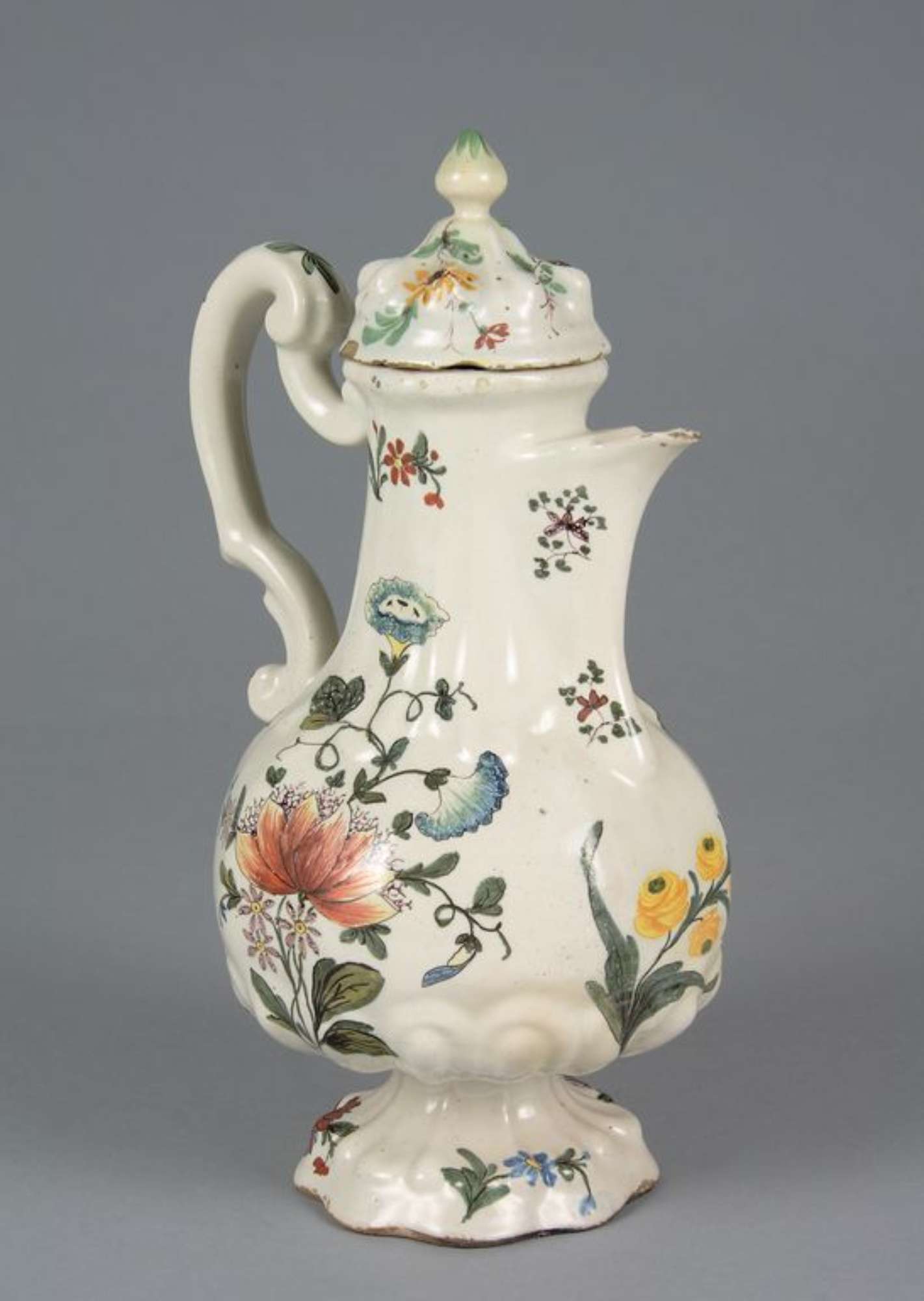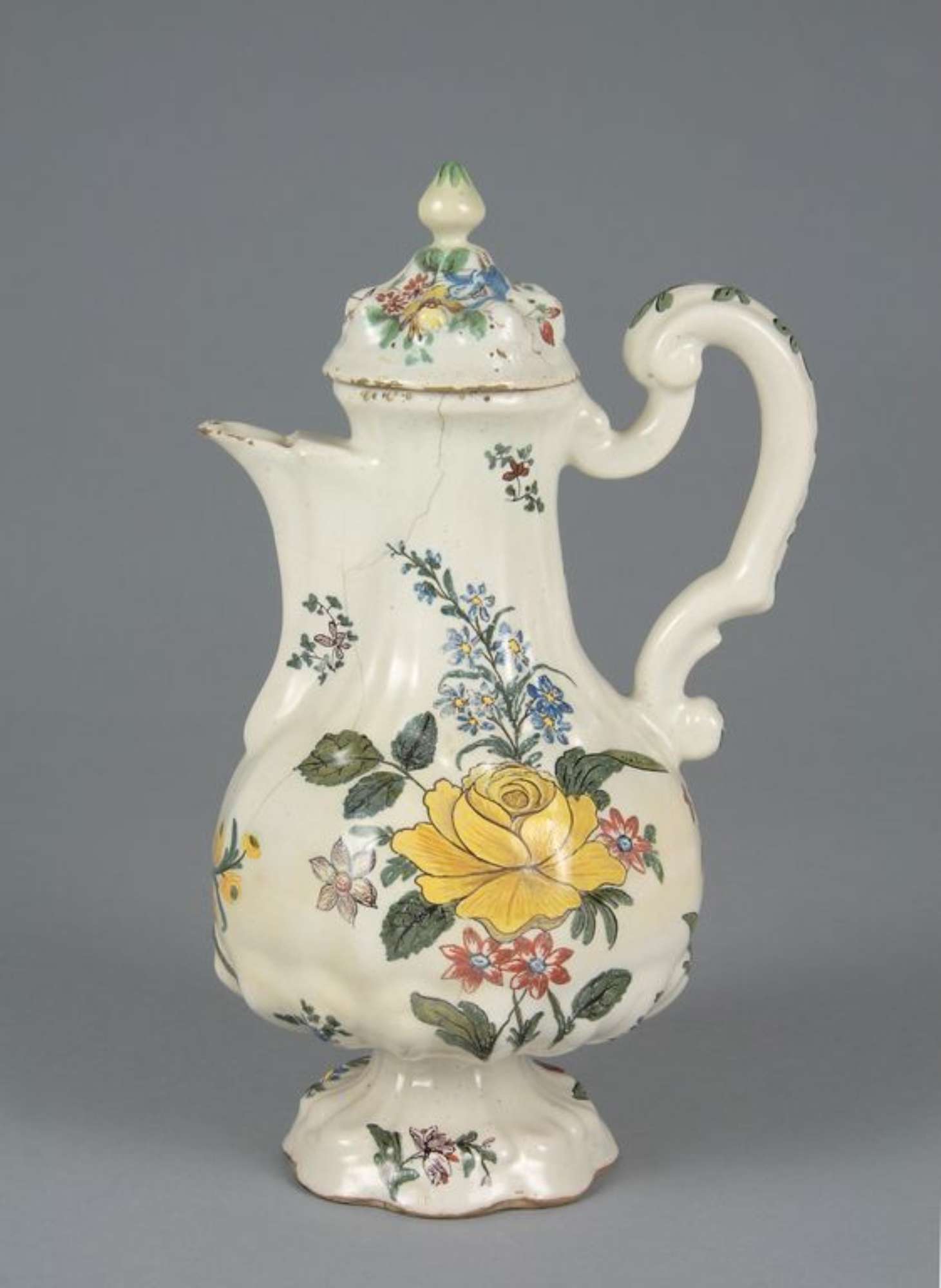 Caffettiera con slanciato corpo piriforme, poggiante su piede a colletto alto e svasato, dotato di versatore a becco e ansa a voluta; il coperchio è cuspidato "a cuffia" con presa a pigna. La decorazione è composta da due ampi bouquet dai fiori contornati, attorniati da rametti fioriti che si ripetono nel coperchio e nell'ansa. Dipinto a pennello, a gran fuoco, in blu, bruno nerastro, bruno violace, giallo, rosso e verde su smalto bianco.