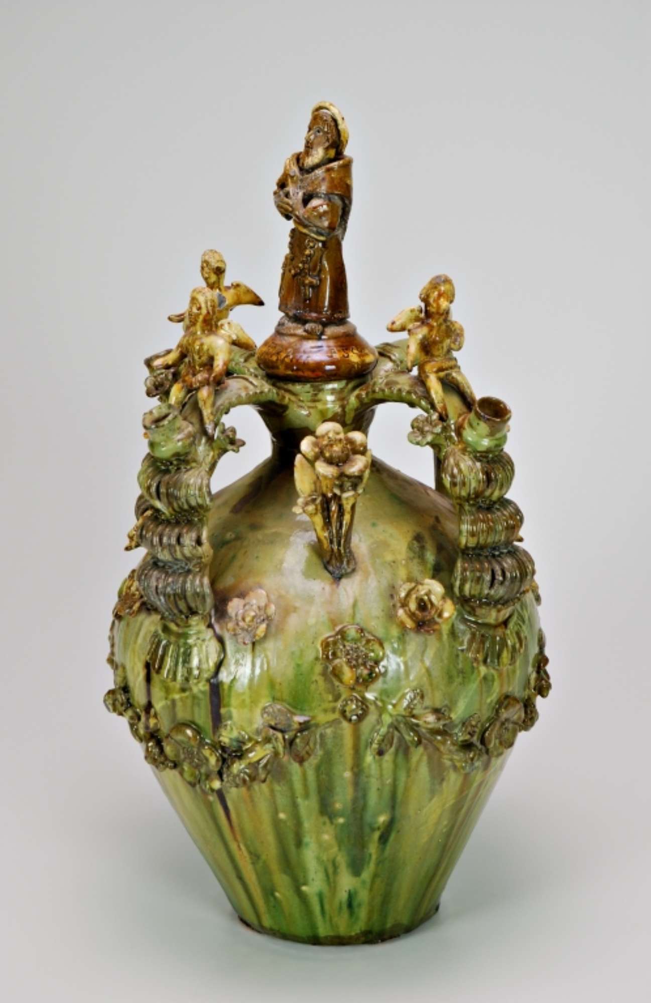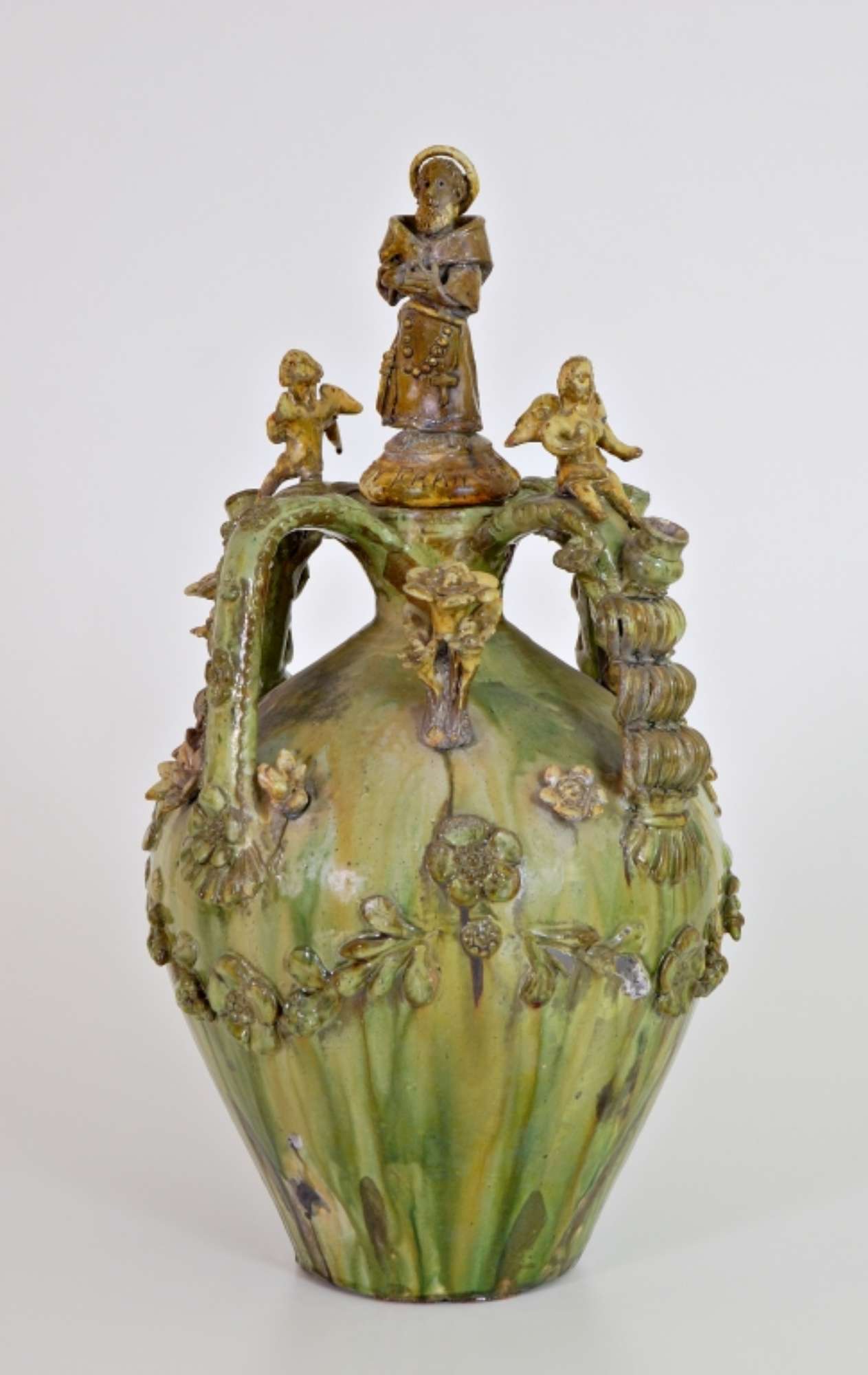 Orcio a forma ovoidale con colletto e quattro anse a fascia con ornati plastici a rilievo. Su tre di esse sono applicati i beccucci e tre figure di angioletti plasticati a tutto tondo. Sul corpo decorazione in rilievo con ramoscelli fioriti, fiori e festoni. Sul coperchio la figura modellata di San Francesco d'Assisi; al di sotto l'iscrizione incisa nella pasta "SAN FRANCESCO d'assisi".