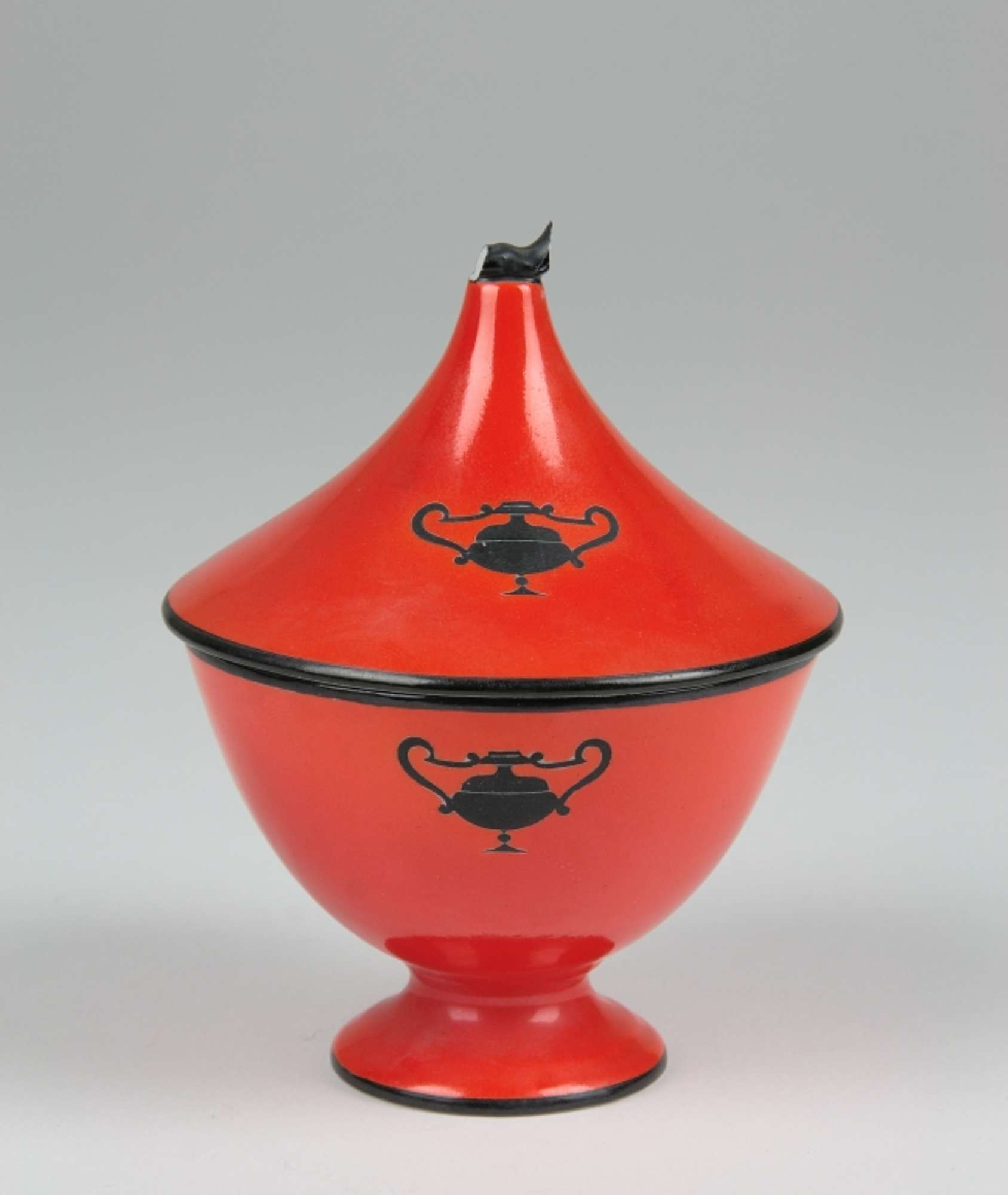 Corpo a calotta poggiante su piccolo piede svasato; alto coperchio svasato con presa apicale ad anello. Decorato con quattro vasetti dipinti in nero; neri gli orli e l'ansa. Vetrina di colore rosso corallino (modello 262S, dec. 107E). Marcato nel piede.