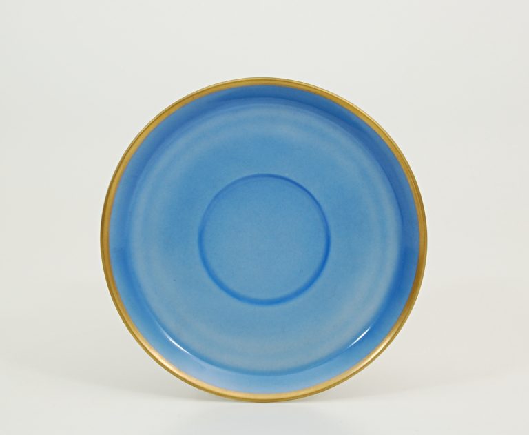 Liscio. Smalto azzurro con filetto d'oro all'orlo. Nel piede marca di fabbrica. (Servizio azzurro e oro, forma impero).